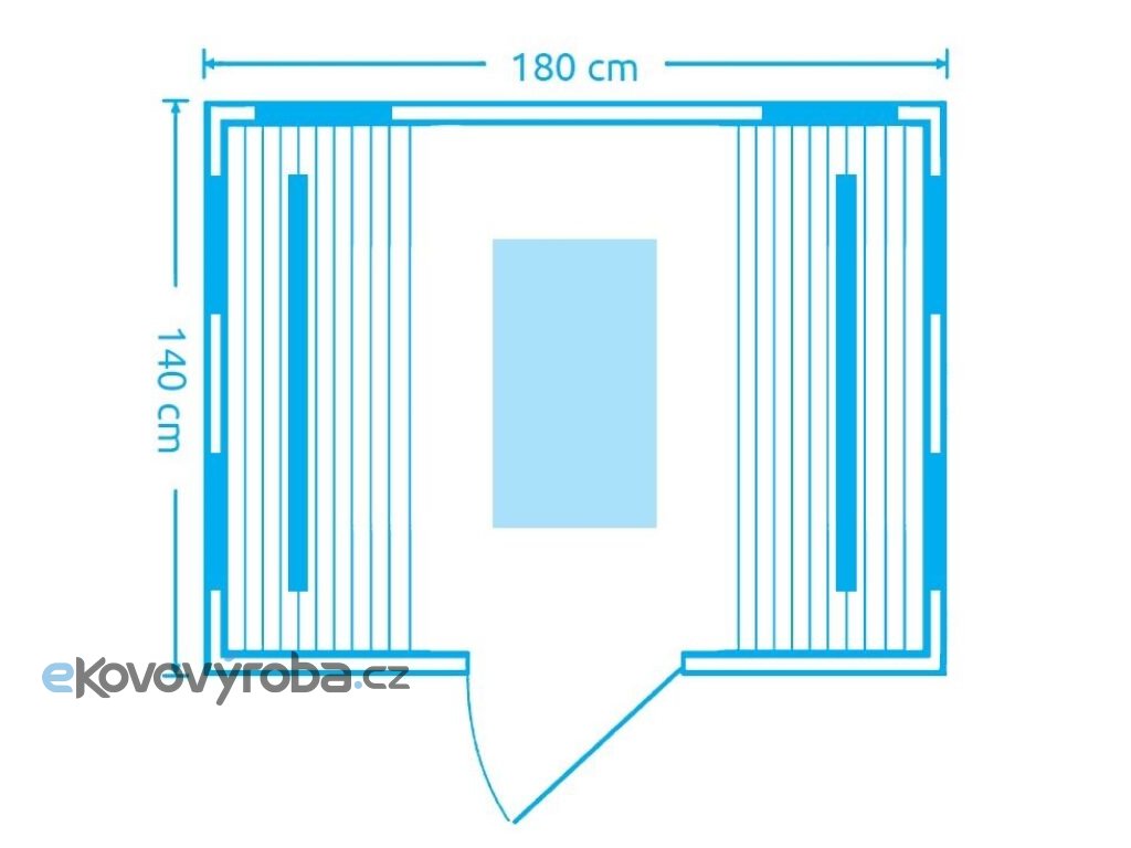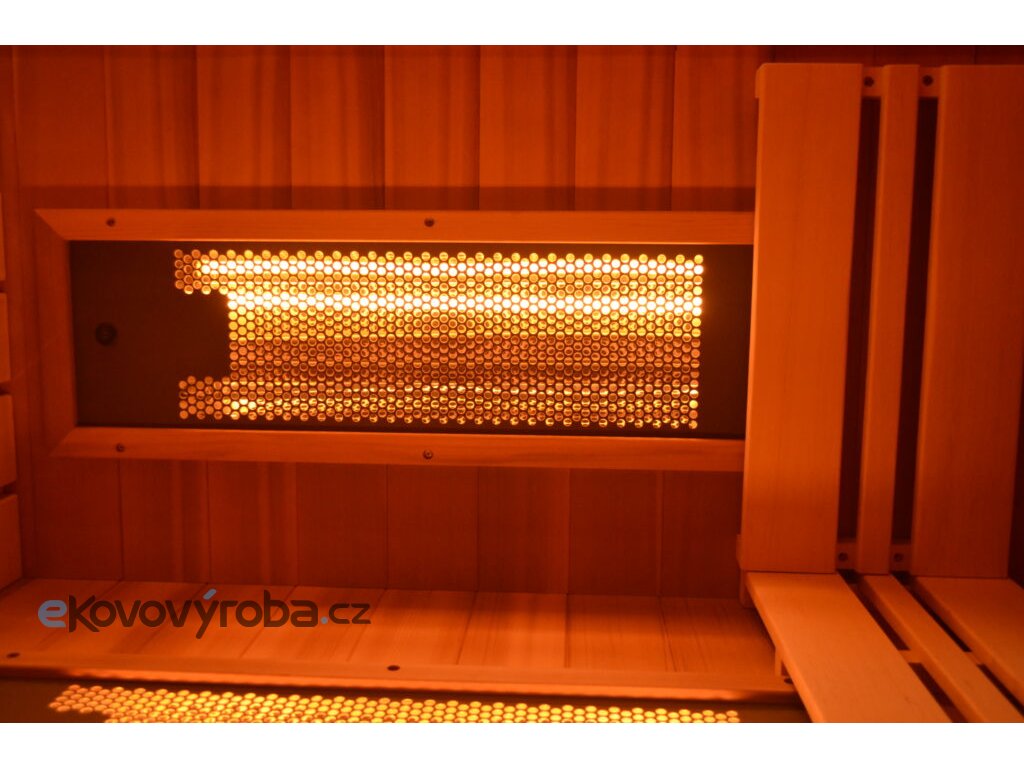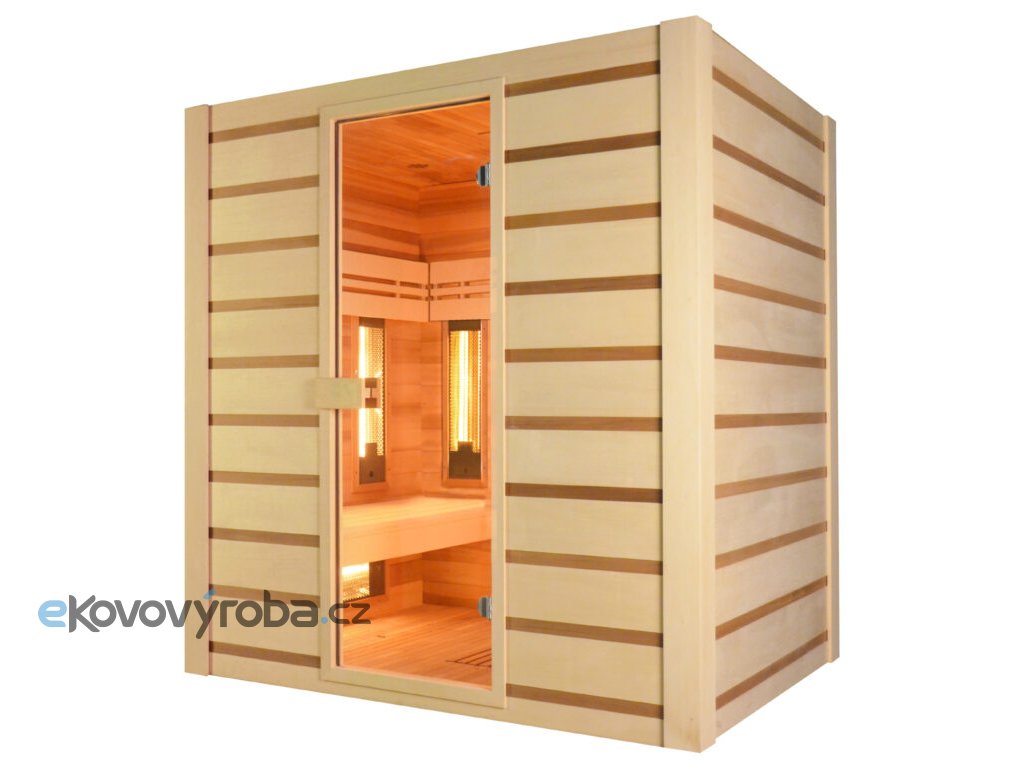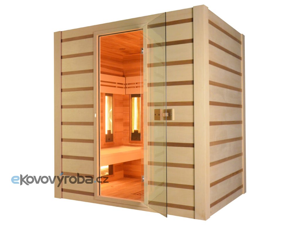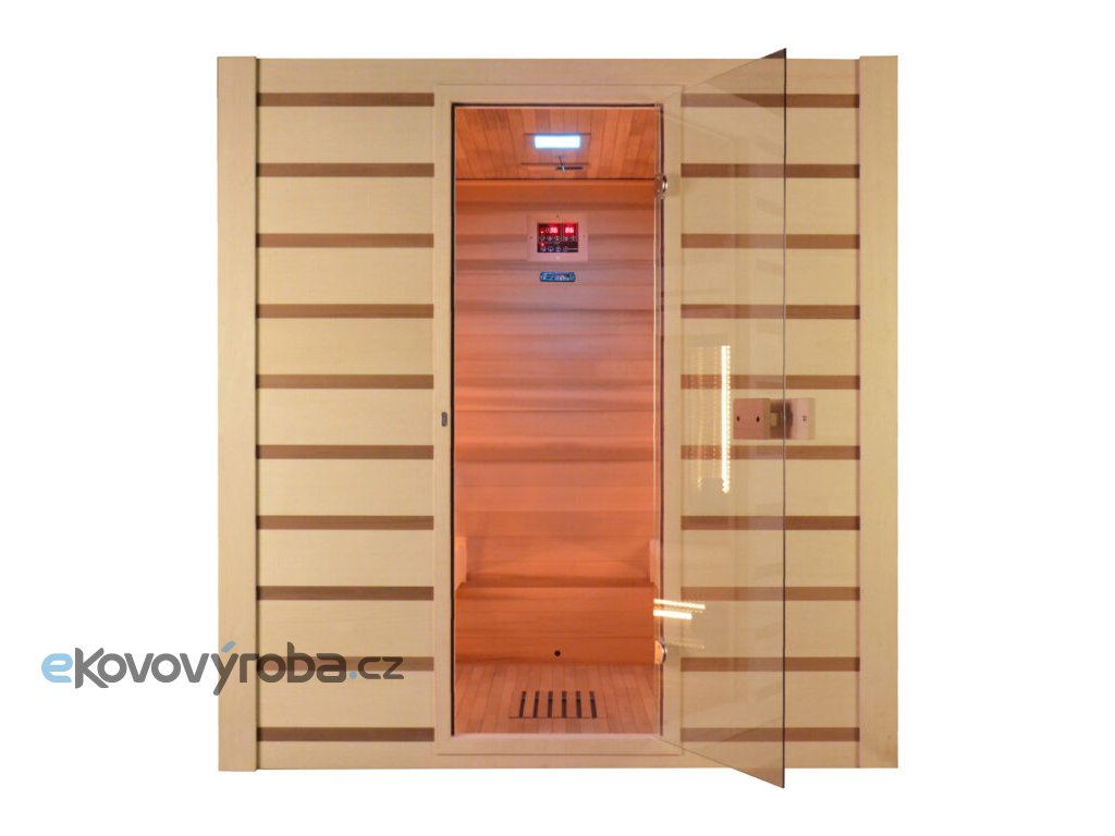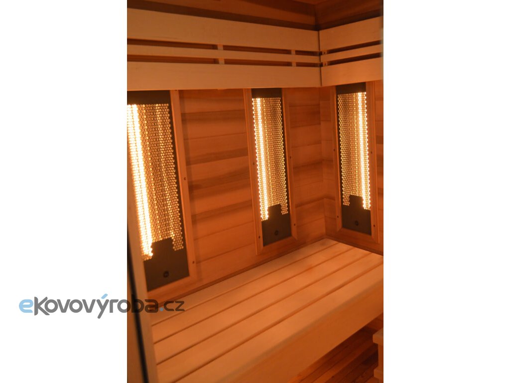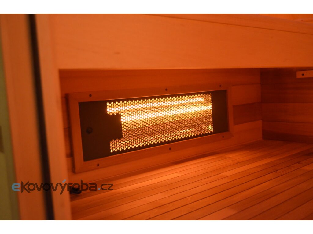 Počet osob: 4+, materiál: vnitřní: Hemlock / vnější: Brazilské bílé dřevo + cedr, Druh a počet topidel: 8 x redlight / magnesium + 1 x karbon, Zónové ovládání topidel: ANO, Celkový výkon topidel: 2900 W, Otáčení dveři L/P: NE, Rádio/Mp3/Bluetooth: ANO/ANO/ANO, LED barevná terapie: ANO, Osvětlení vnější: NE, LED osvětlení lavice: NE, Stropní světlo: ANO, Madlo (vnitřní/vnější): Dřevo/Dřevo, Ionizátor/Tepelné čidlo/ Ventilace: NE/ANO/ANO. Rozměry vnější (š,h,v):1800x1400x1900mm, Rozměry vnitřní (š,h,v): 1700x1300x1800mm. Rozměry 1ks zabaleného zboží - 1. BALÍK (v,š,d,váha): 1900x1500x200mm, 70 kg, 2. BALÍK (v,š,d,váha): 1900x2000x200mm, 66kg, 3. BALÍK (v,š,d,váha): 1500x2000x200mm, 47 kg. Váha celkem: 183 kg