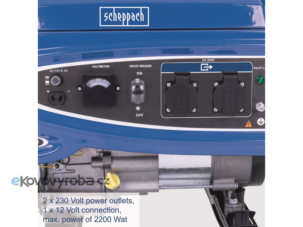 Existuje mnoho důvodů, proč se rozhodnout pro nákup elektrocentrály. Stále existuje mnoho oblastí, kde proud není k dispozici, jindy hrozí při výpadku energie velké hmotné ztráty, lidé potřebují elektřinu u svých zahradních domků, chatek, karavanů, lodí, nezbytný je přísun energie na stavbách. Trvalý výkon 2000 W již dává uživateli možnost napájet nejenom elektrospotřebiče odporového typu (žárovky, topná tělíska, kávovary ap.), ale i celou škálu elektrospotřebičů indukčního typu, u kterých je nutné počítat s větší výkonovou rezervou kvůli rozběhu a ztrátám ve vinutí elektromotoru při provozu (ruční el. nářadí, el. čerpadla atd.). Pro kvalitu elektrocentrály je klíčovým prvkem motor a alternátor. Scheppach používá jen certifikované motory a alternátory prověřené v dlouhodobých zátěžových testech při nepřetržitém provozu. Navíc jsou elektrocentrály Scheppach vybaveny špičkovým napájením s automatickou regulací AVR (Automatic Voltage Regulator), takže nepoškodí ani spotřebiče náročnější na kvalitu napájecího proudu. Součástí je i voltmetr, ochrana proti přetížení a signalizace nízké hladiny oleje. Velká nádrž 15 l s ukazatelem paliva dovolí uživateli mnohahodinový bezstarostný provoz, ochranný ocelový rám chrání centrálu před poškozením a přepravní madla výrazně ulehčují transport stroje.