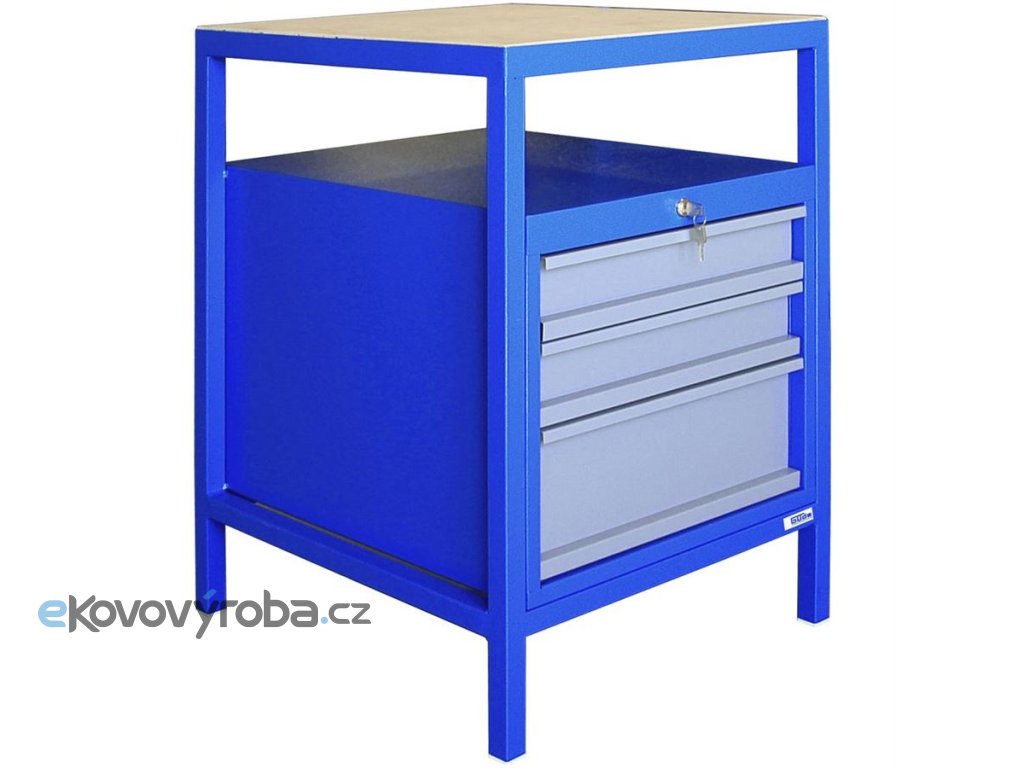 Vybavení: 3 zásuvky (-> 2 x výška 100 mm/1 x výška 180 mm, bezpečnostní zarážky proti neúmyslnému vysunutí, centrální uzamykání cylindrickým zámkem, 2 klíče); odkládací plocha pod pracovní deskou; nohy stolu z uzavřených ocelových profilů (-> 4 příčné stabilizační výztuže).