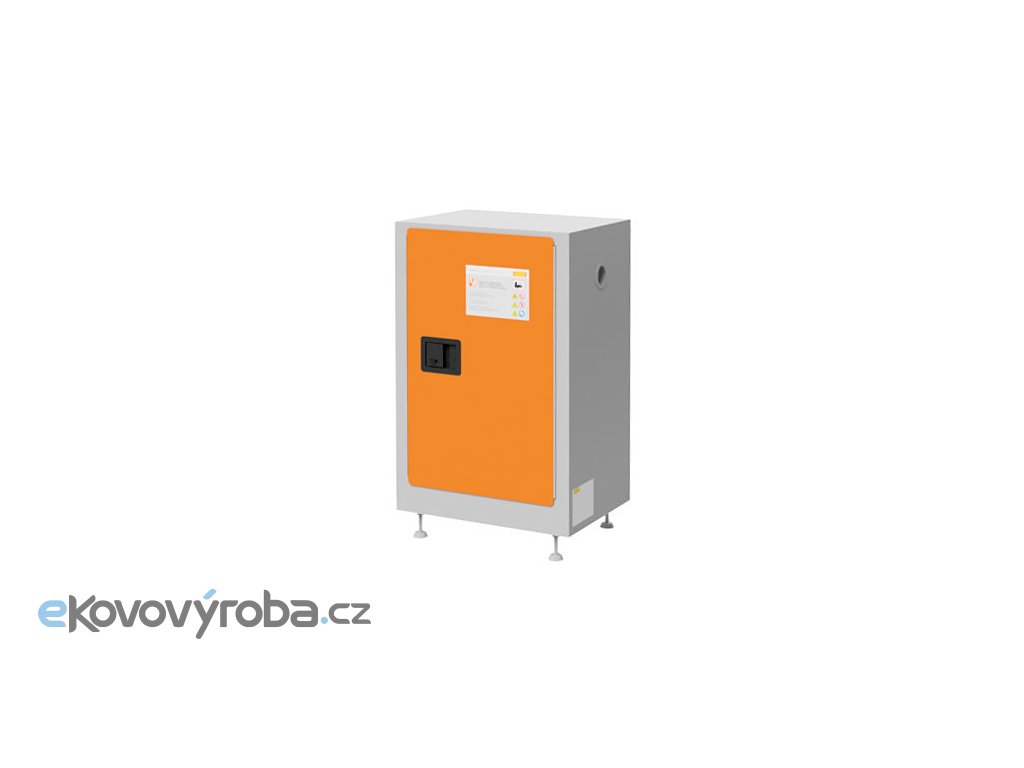 Bezpečnostní skříň pro skladování AKU článků k Vašemu nářadí, zahradní technice nebo nádržím. Dvouplášťová ocelová skříň s tepelnou izolací v korpusu, dvouplášťovými dveřmi se stavítkovým zajištěním dveří, které lze uzamknout. Vnitřek skříně je odvětráván pomocí otvorů, které musí být napojeny na odvětrávací systém a případné spaliny odváděny mimo budovu. Skříň je na nožičkách, aby se v případě havárie dala snadno přemístit na bezpečné místo nebo zcela mimo budovu. Standardní vybavení tvoří i kouřové čidlo včetně zvukového alarmu. Rozměry skříně 59x46x89 cm