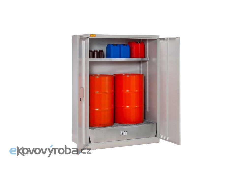 Kovová skříň s křídlovými dveřmi pro uložení 2 sudů 200 litrů a policí na malé kanystry se záchytným objemem 30 litrů. Spodní kovová záchytná vana má objem 210 litrů a je opatřena ocelovým zinkovaným roštem. Skříň je lakovaná práškovou vypalovací barvou v odstínu RAL 7035, na dveřích jsou větrací otvory v horní a spodní části. Skříň odpovídá předpisů pro skladování nebezpečných látek (vyjma hořlavin) uvnitř budovy podle TRGS 510.