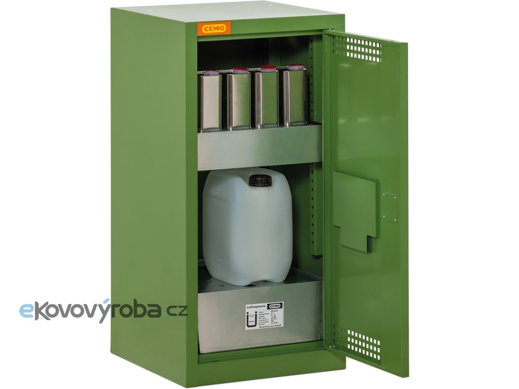 Kovová skříň na uložení postřiků a přípravků na ochranu rostlin 50x50x100 cm. Skříň je vybavena jednou záchytnou vanovou přestavitelnou policí o objemu 20 litrů s nosností 50 kg a záchytnou vanou na dně skříň o objemu 30 litrů. Dveře skříní jsou na horní a spodní straně opatřeny perforovanými otvory pro odvětrání vnitřku skříně. Na vnitřní straně skříně je umístěná kapsa pro uložení dokumentace