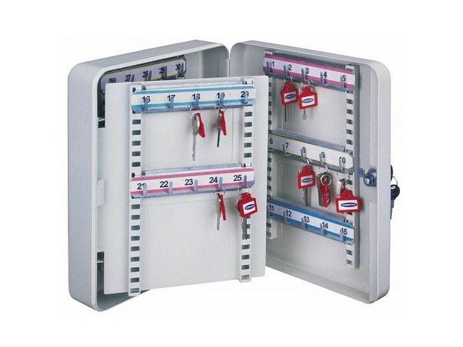 Vyrobeno z kvalitního ocelového plechu. Určeno pro upevnění na stěnu. Opatřeno pochromovaným cylindrickým zámkem s 2 klíči. Lišty na klíče jsou přestavitelné po 10 mm a jsou očíslovány.