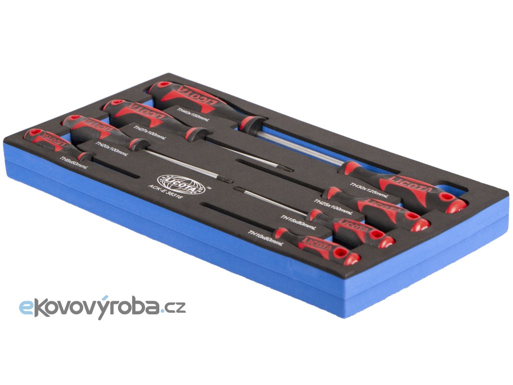 Pěnová vložka o rozměrech 190 x 380 mm obsahuje celkem 8 ks profesionálních Torx šroubováků o velikostech T8 - T40.