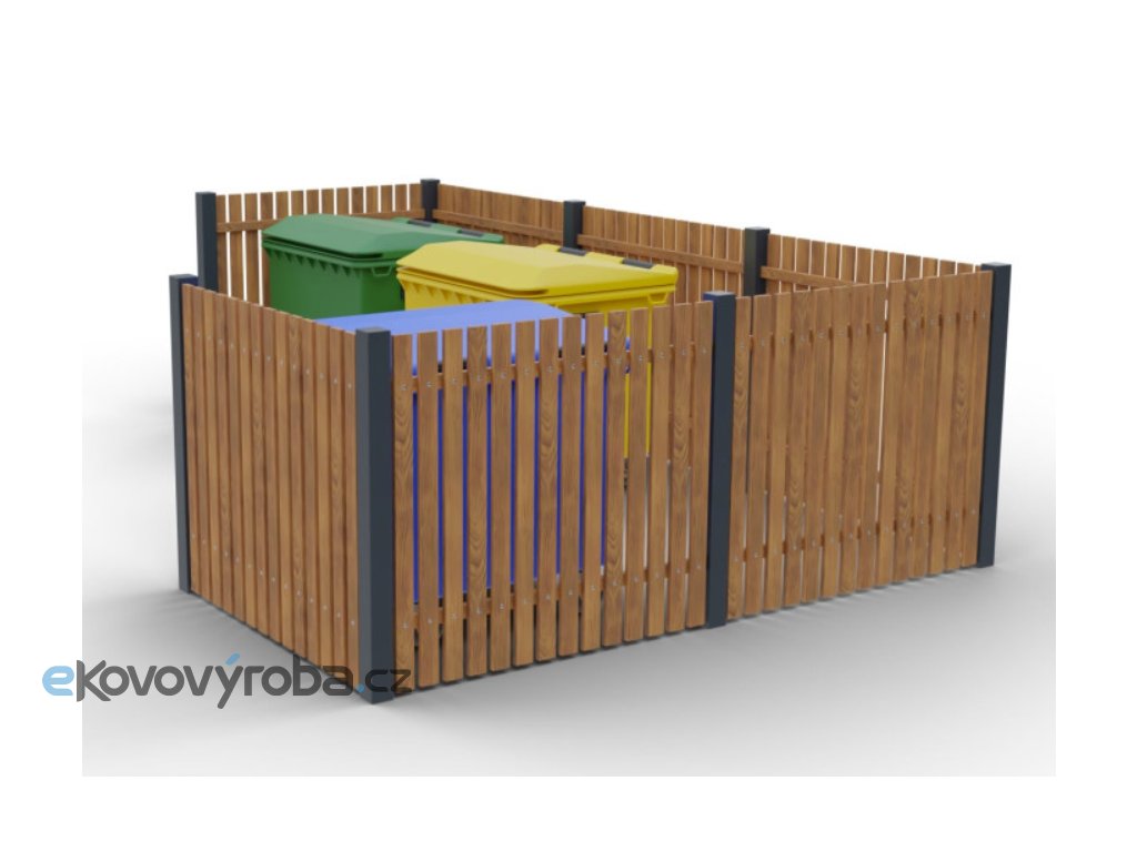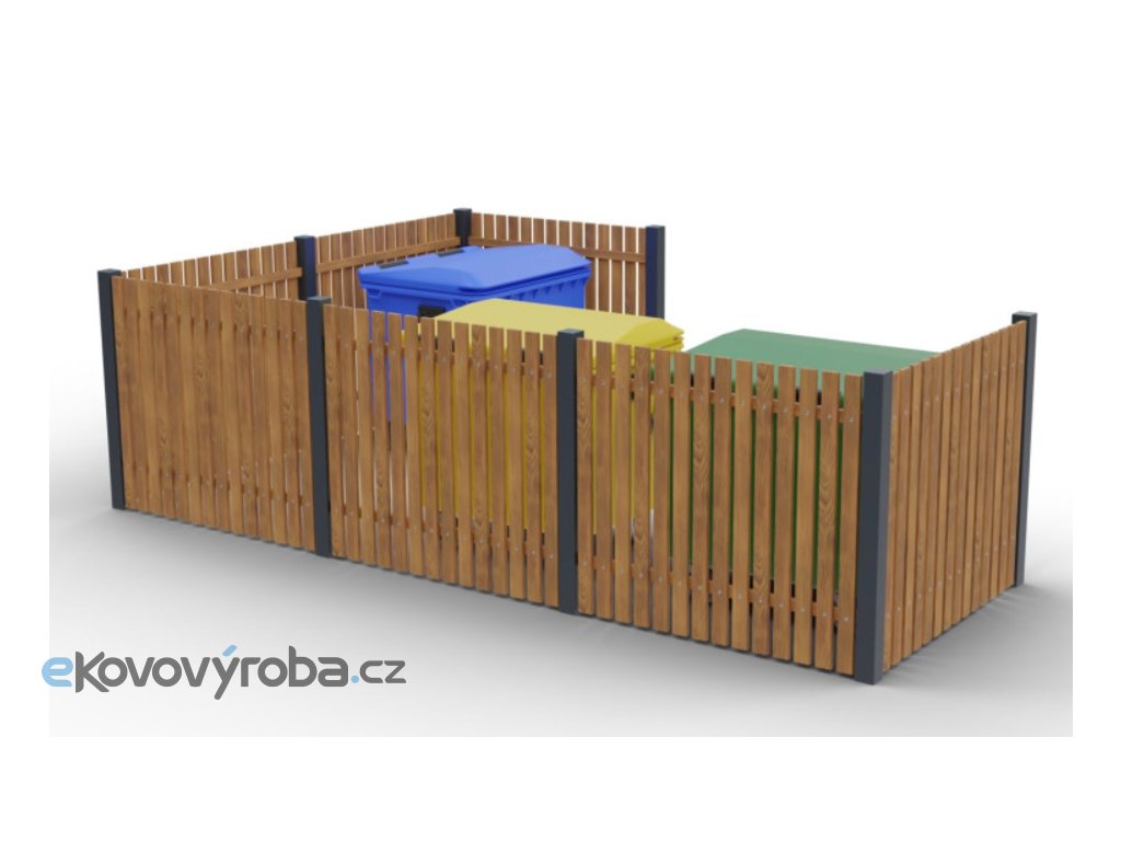 Modulární hrazení Eko IV je určeno pro čtyři standardní kontejnery. Konstrukce z ocelových jaklů doplněná dřevěným obložením poskytuje stabilní a estetické řešení pro dlouhodobé venkovní použití.