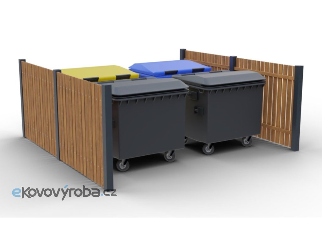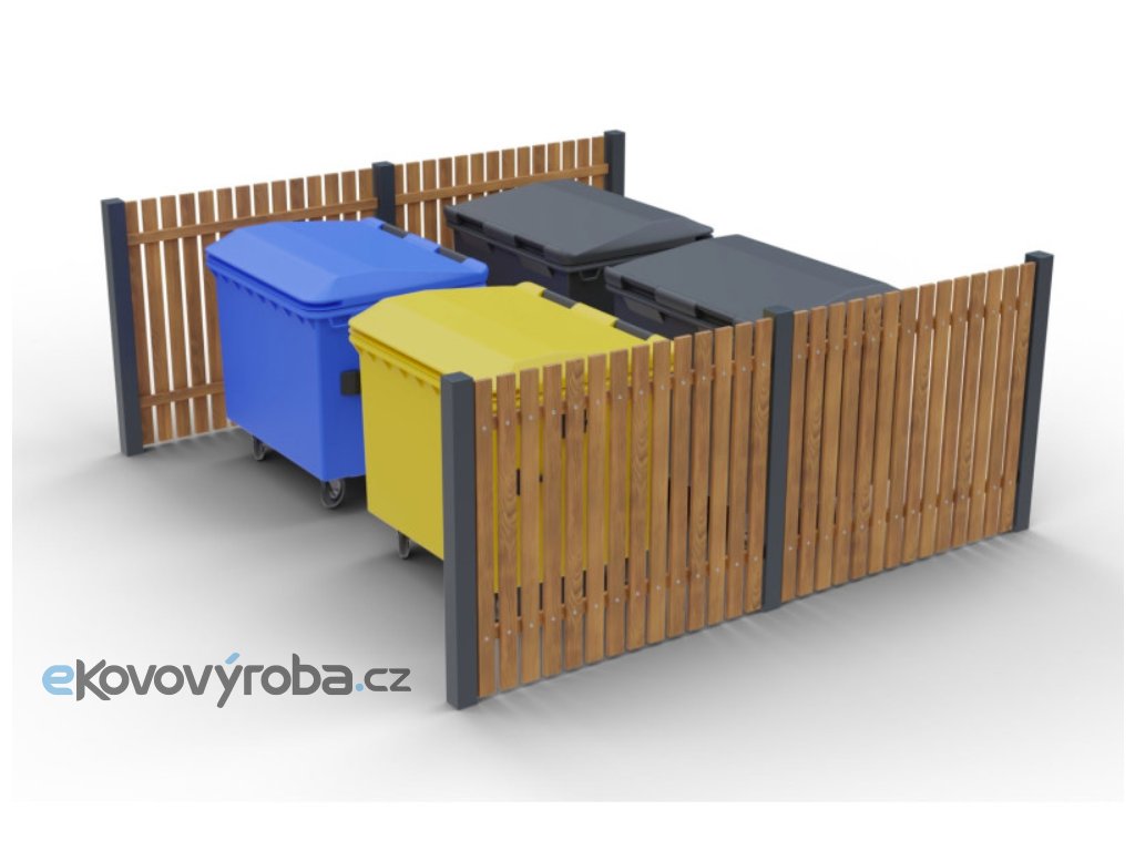Ocelový jakl tvoří stabilní rám, dřevěné obložení doplňuje vzhled a pomáhá udržet okolí kontejnerů upravené.