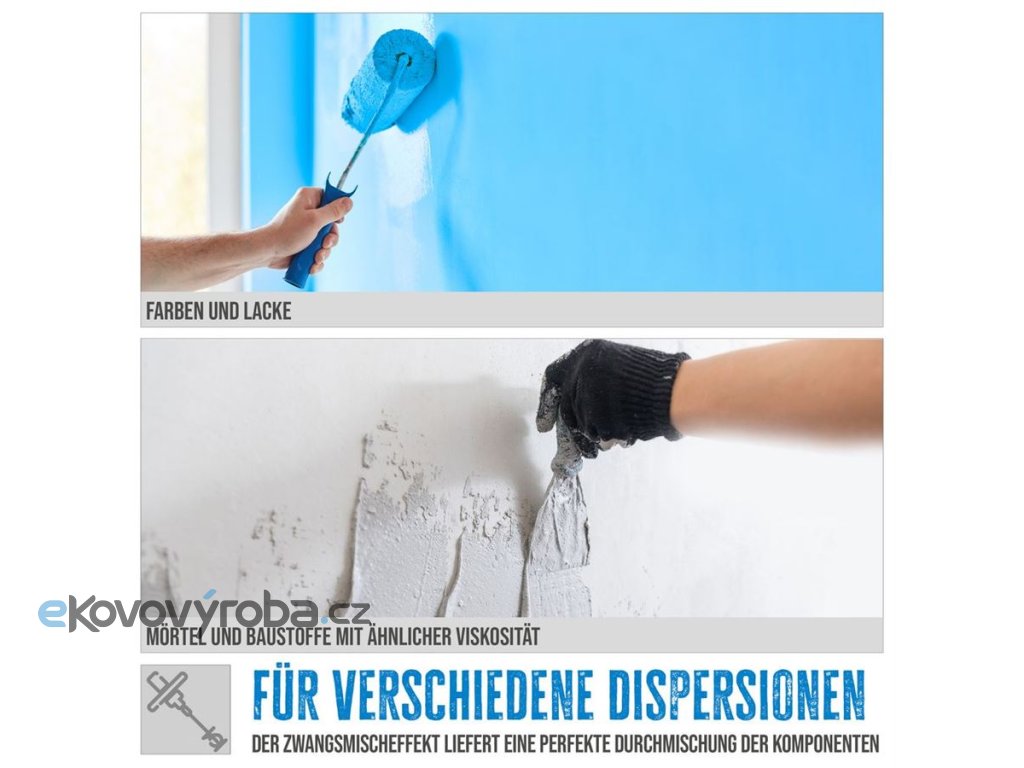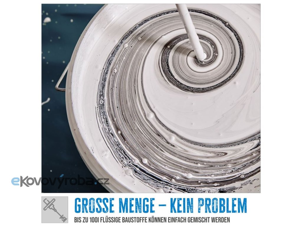 Důkladné (rovnoměrné) promíchání malt, omítek, spárovacích hmot, hydroizolací, lepidel, laků, barev ap. do objemu až 100 l.