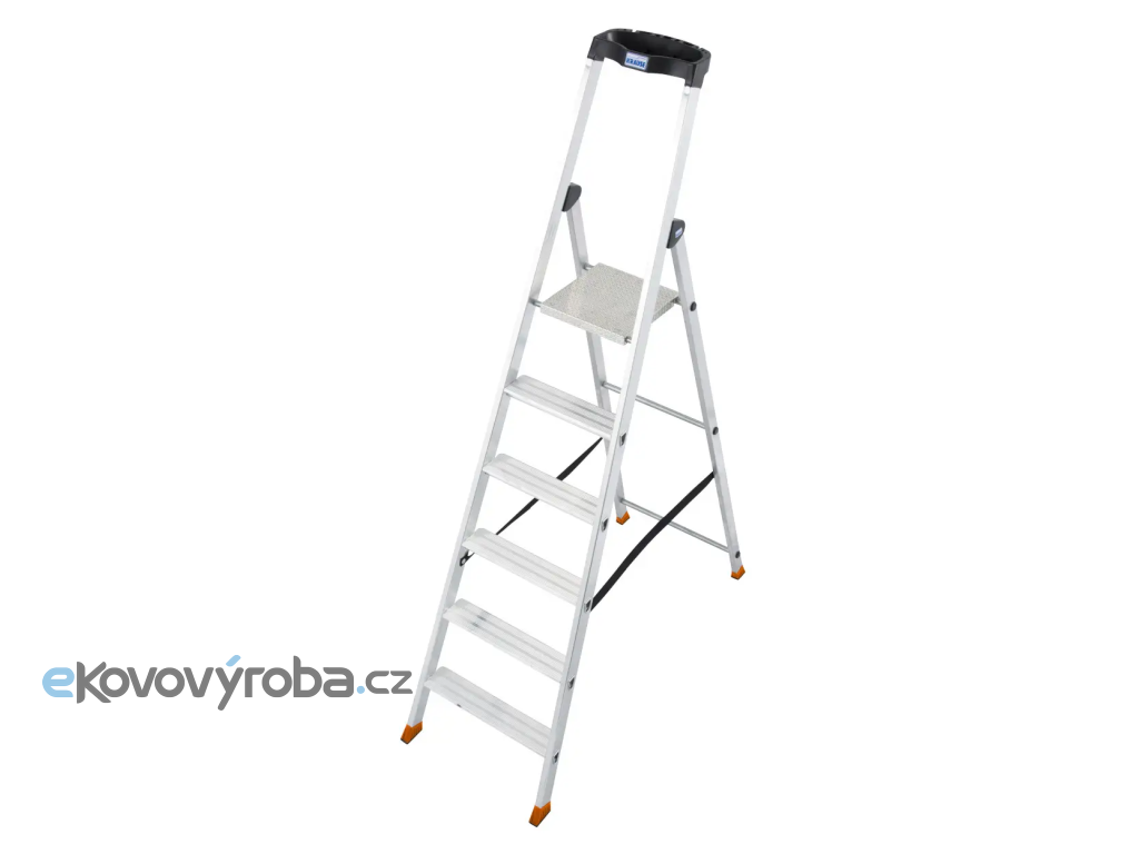 Jednostranné hliníkové schůdky s poličkou na nářadí mají odolnou a lehkou konstrukci a vysokou stabilitu. Horní část je prodloužena a tvoří zábradlí proti přepadnutí. Příčky jsou protiskluzové, pohodlné při nášlapu a díky tomu bezpečné. Velikost nejvyšší příčky umožňuje bezproblémové stání a zároveň funguje jako zajištění štaflí při plném roztažení. Panty a spoje jsou z oceli. Hmotnost je jen 6 kg. Patky mají opět protiskluzovou úpravu a zároveň polštářky, které chrání podlahu před poničením. |