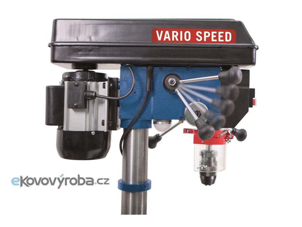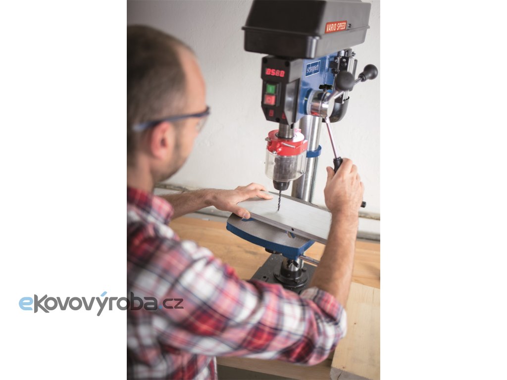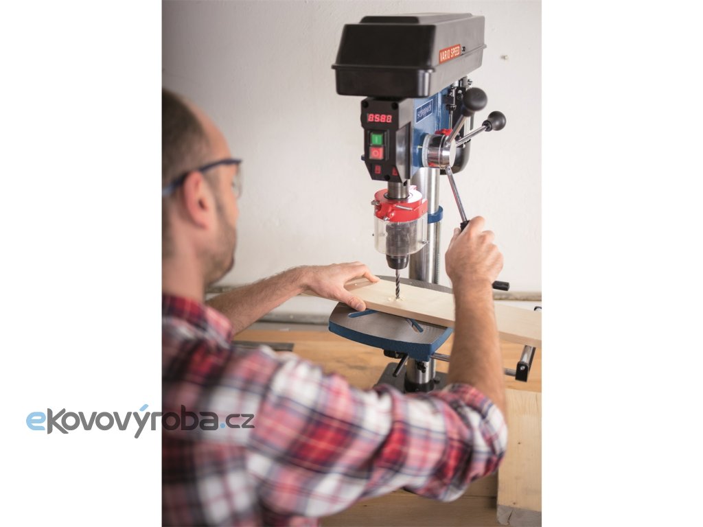 Stojanová vrtačka Scheppach DP 18 VARIO je nadstandardně vybavený model stojanové vrtačky vhodný hlavně pro náročné domácí kutily, řemeslníky, do menších dílen ap. Vybrat si tu správnou rychlost pro zvolený druh materiálu je u tohoto stroje hračka. Jednoduchým pohybem páky na levé straně stroje si měníte plynule rychlost vrtání. Tu Vám navíc indikuje digitální display na čele stroje. Můžete tak bez obav vrtat do kovů, plastu nebo měkkého i tvrdého dřeva. Dalšími prvky, které usnadňují a zpříjemňují ovládání vrtačky je křížový laser, který umožní snadnou orientaci při vrtání a urychlí práci při vrtání větších sérií obrobků. Dále je to světlo, osvětlující pracovní část plochy a výsuvné rozšíření stolku s rolnou, které se hodí při práci s delšími obrobky. Stroj má robustní ocelovo-litinovou konstrukci, rychloupínací sklíčidlo 16 mm ve standardu a silný motor 550 W, který si poradí s jakýmkoliv materiálem. Vrtačku můžete za příplatek dovybavit i svěrákem. Stroj samozřejmě splňuje poslední požadavky evropské unie na bezpečnost, jako je např. hlavní vypínač umístěný na čele stroje, průhledný kryt sklíčidla ap. Stroj je umístěn na stabilním podstavci s možností pevného uchycení šrouby k pracovní desce nebo podlaze. Upnutí vrtáku je možné buď pomocí tradičního sklíčidla nebo pomocí morse kuželu (MK2).