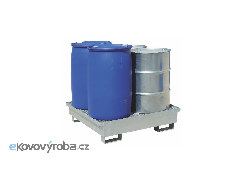 Ocelová žárově zinkovaná záchytná vana s žárově zinkovaným roštěm. Záchytná vana pro skladování 4x 200 l. Provedení s roštem usnadňuje manipulaci se sudy. Vybaveno pro manipulaci VZV technikou. Záchytná vana musí být při manipulaci VZV v prázdném stavu.