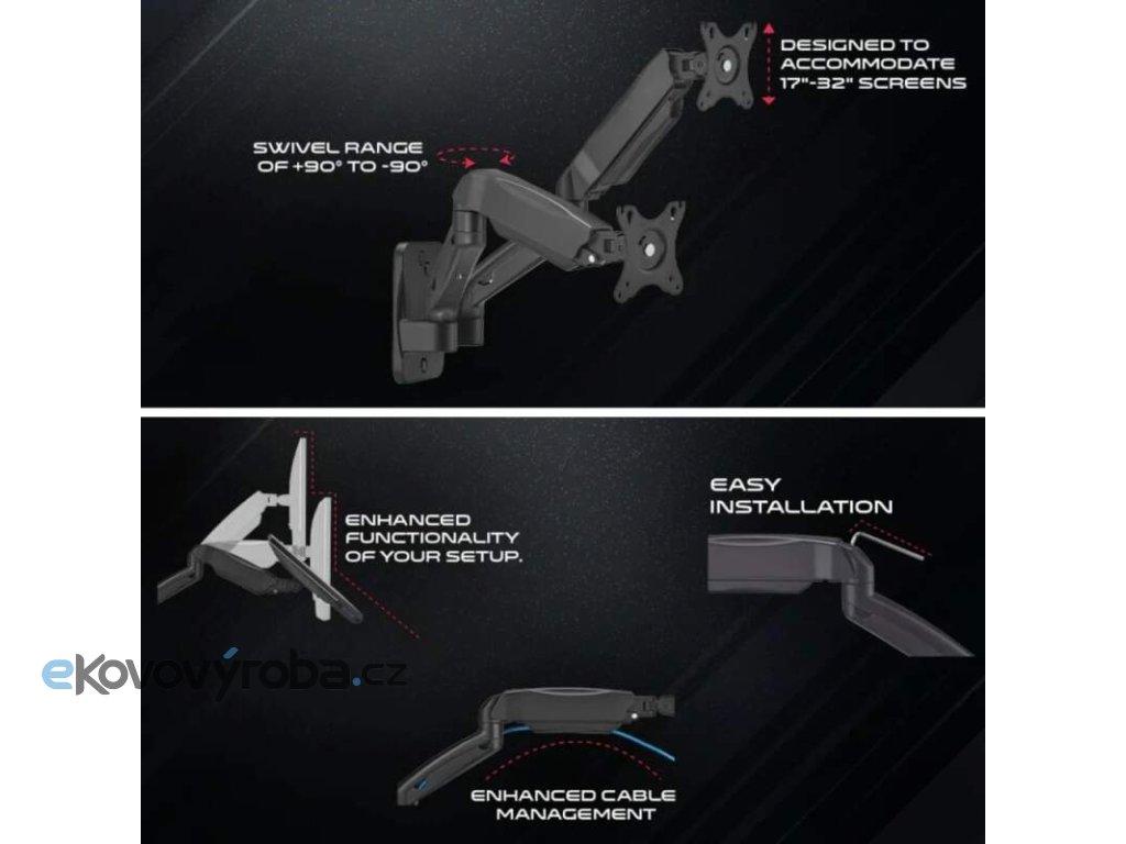 Nástěnný držák na 2 Tv / monitory 17" - 32", otáčení až 45°, naklápění +90° / -45°, vzdálenost od zdi 100-467 mm, výškové polohování 248 mm, VESA 75x75 a 100x100, nosnost 2x 9 kg