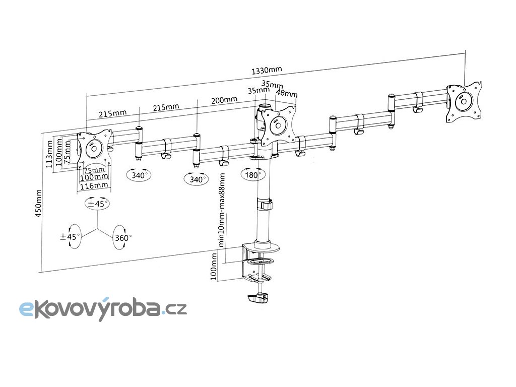 Stolní kancelářský držák na 3 monitory 13" - 27", polohovatelnost monitorů, otáčení do stran +/- 90°, naklápění +/- 45°, výškové polohování 100 - 450mm, VESA standardy 75x75 a 100x100, 2 typy stolních úchytů, instalační materiál, nosnost 24kg
