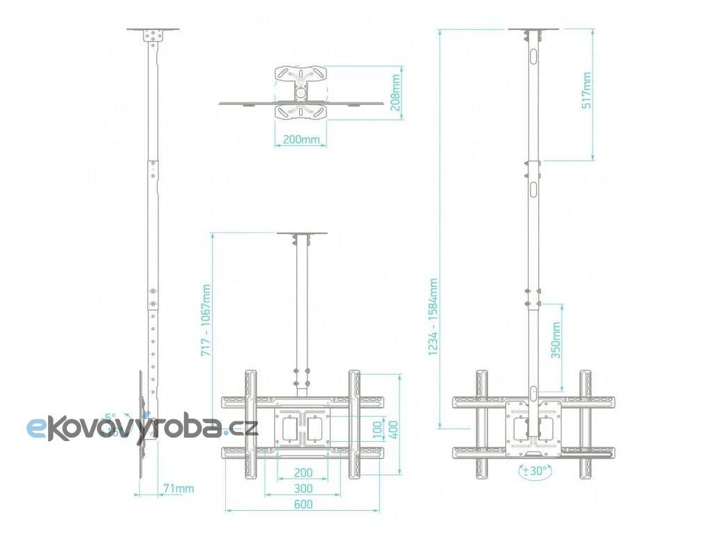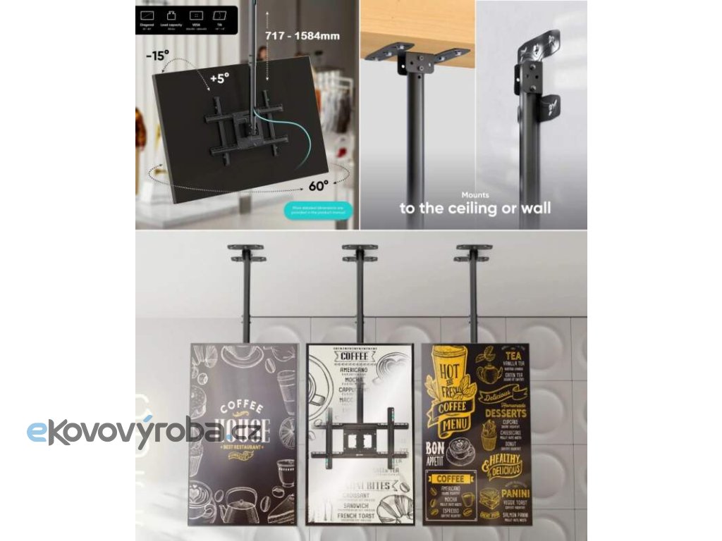 Kvalitní stropní držák na Tv monitor 32" - 80", nastavitelná délka 717-1584 mm, naklápění +5° / -15°, otáčení +30° / -30°, instalační materiál, VESA standardy 100x100 až 600x400, nosnost 68,2 kg