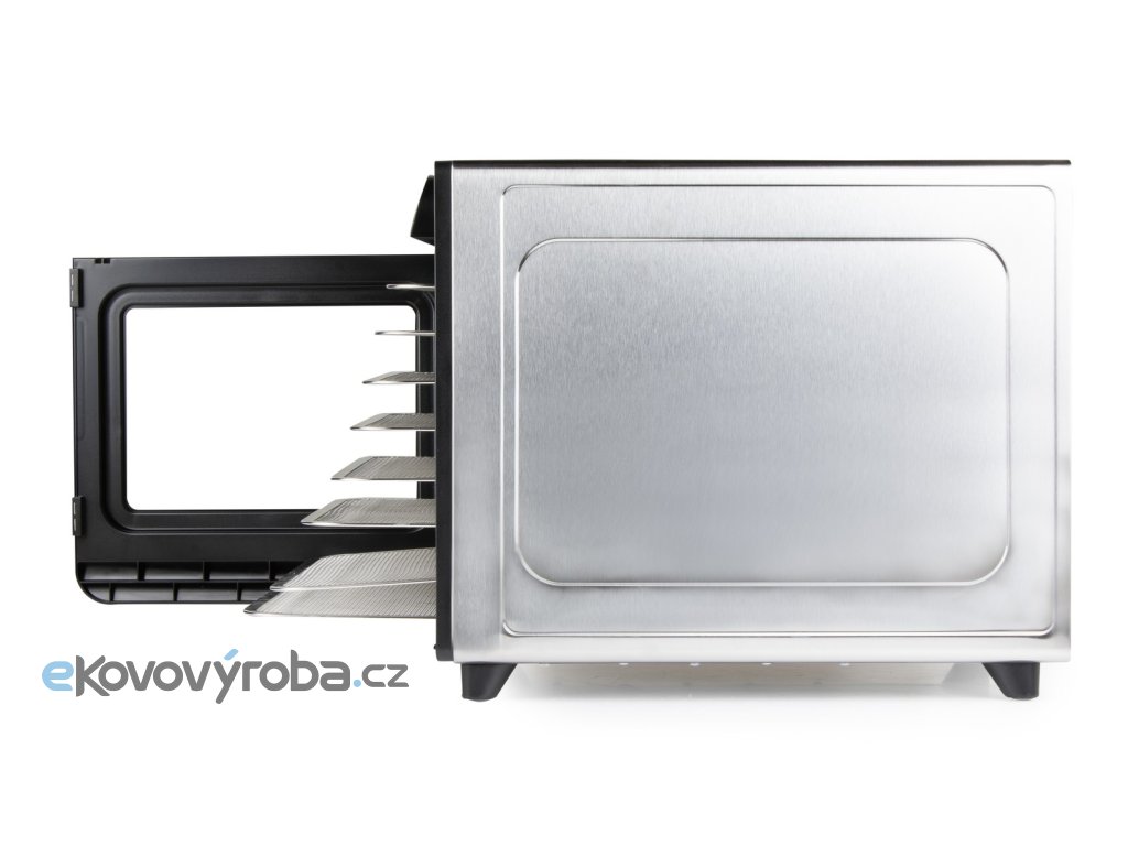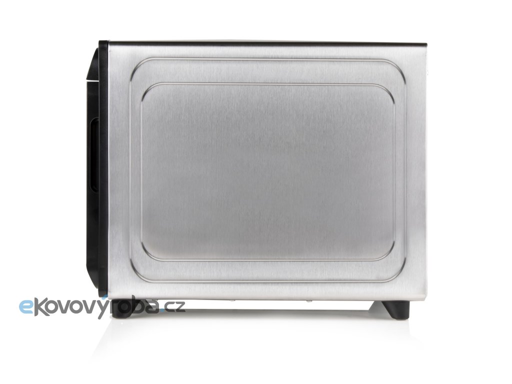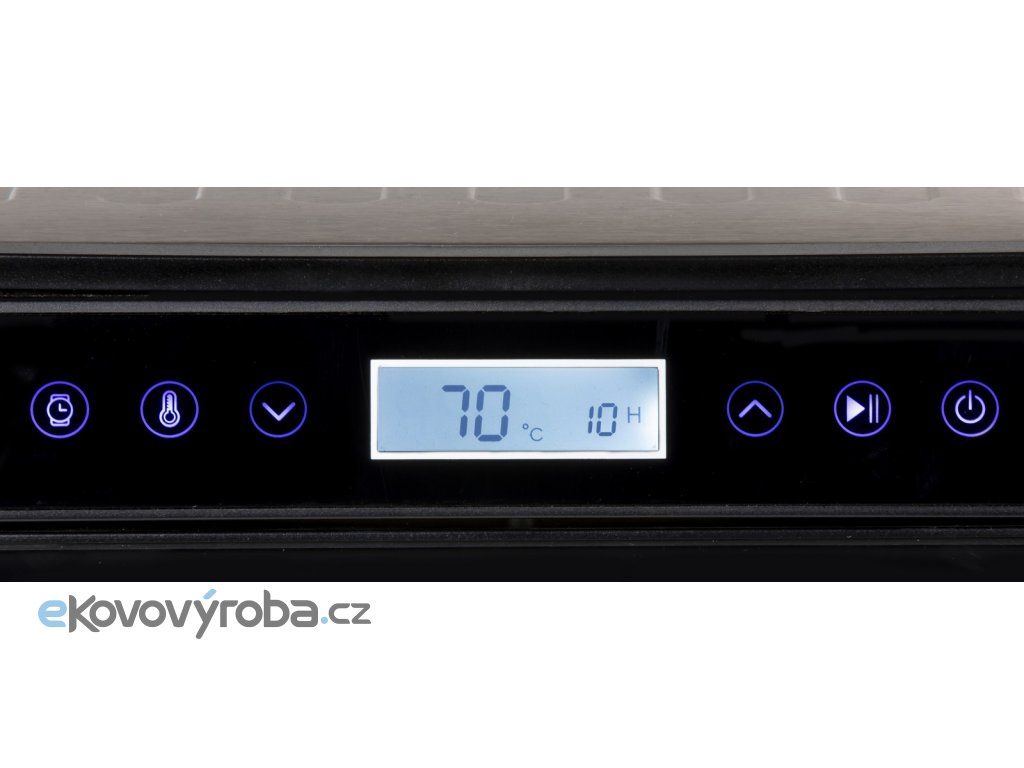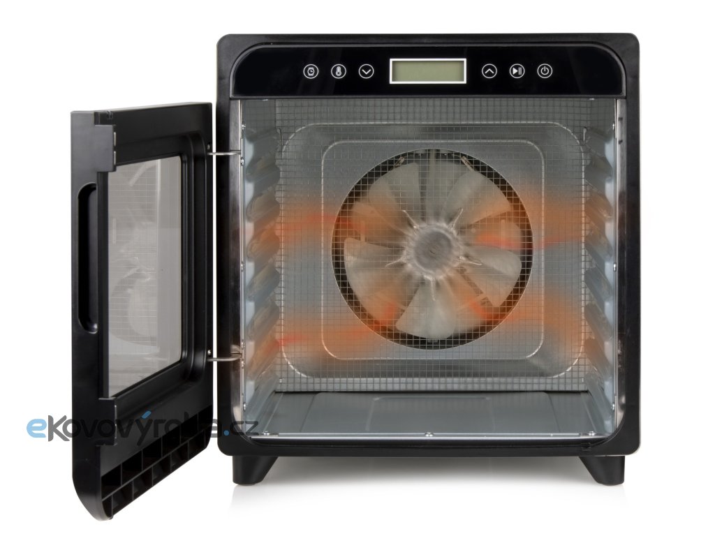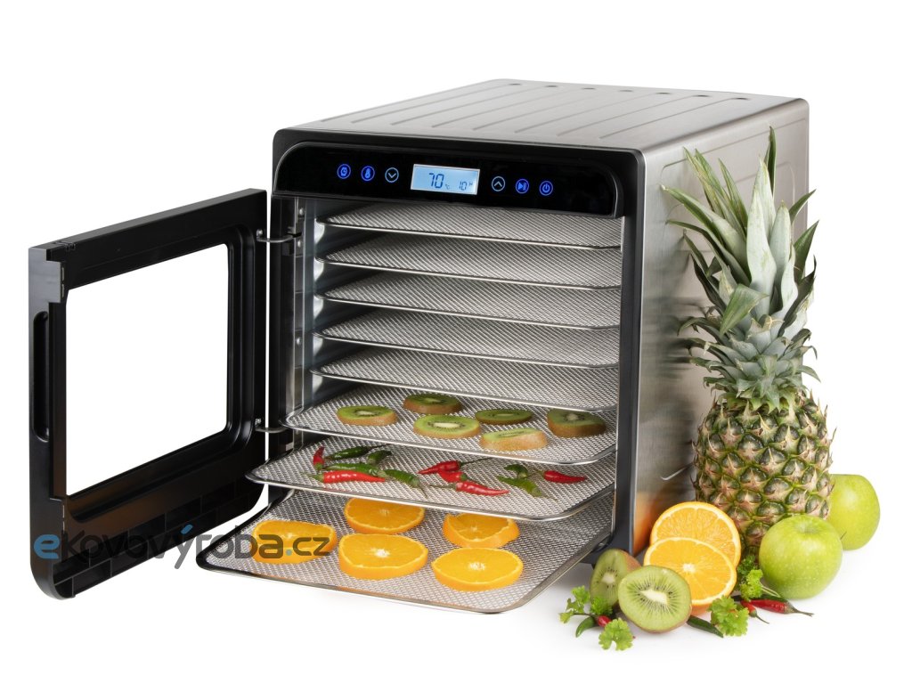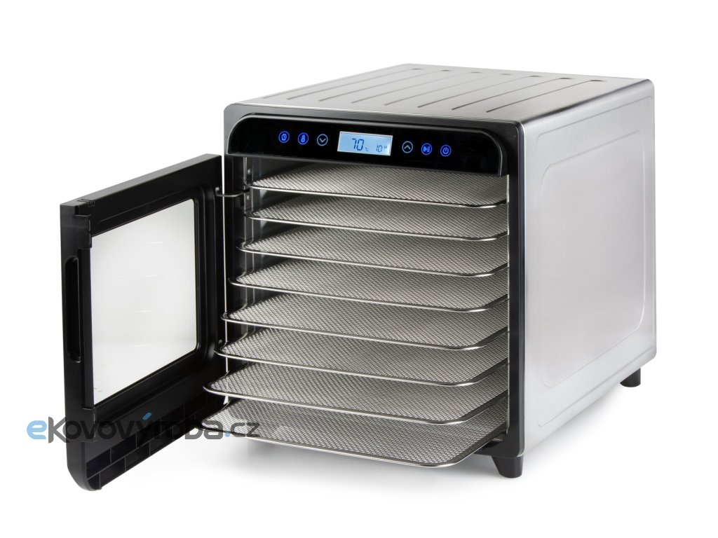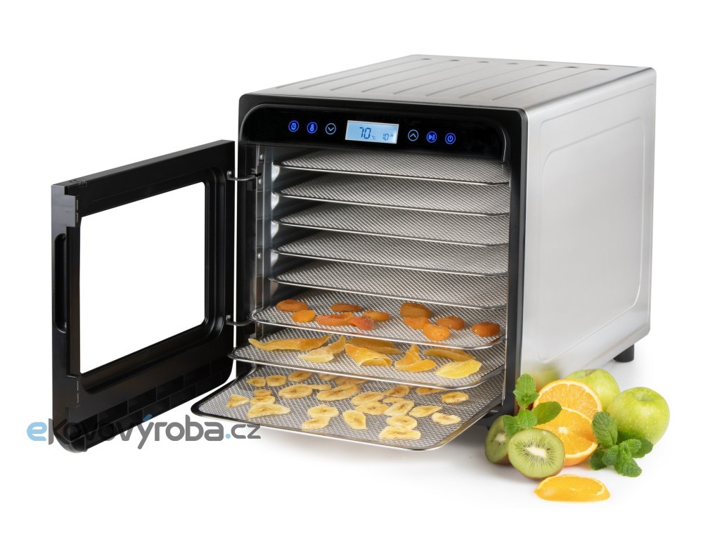 Výkonná a robustní sušička ovoce s tělem z vysoce kvalitního broušeného nerezu vybavená ventilátorem o velkém průměru, přesným digitálním ovládáním teploty a digitálním časovačem.
