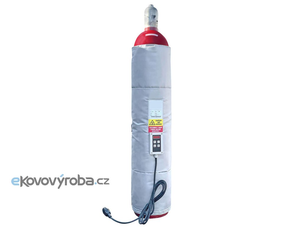 Vyhřívací návlek na tlakové láhve na technické plyny. Rozměr pláště 860x1050 mm, výkon vyhřívání 435 W / 230V s digitálním termostatem s řízením teploty od 0°C – 90°C.