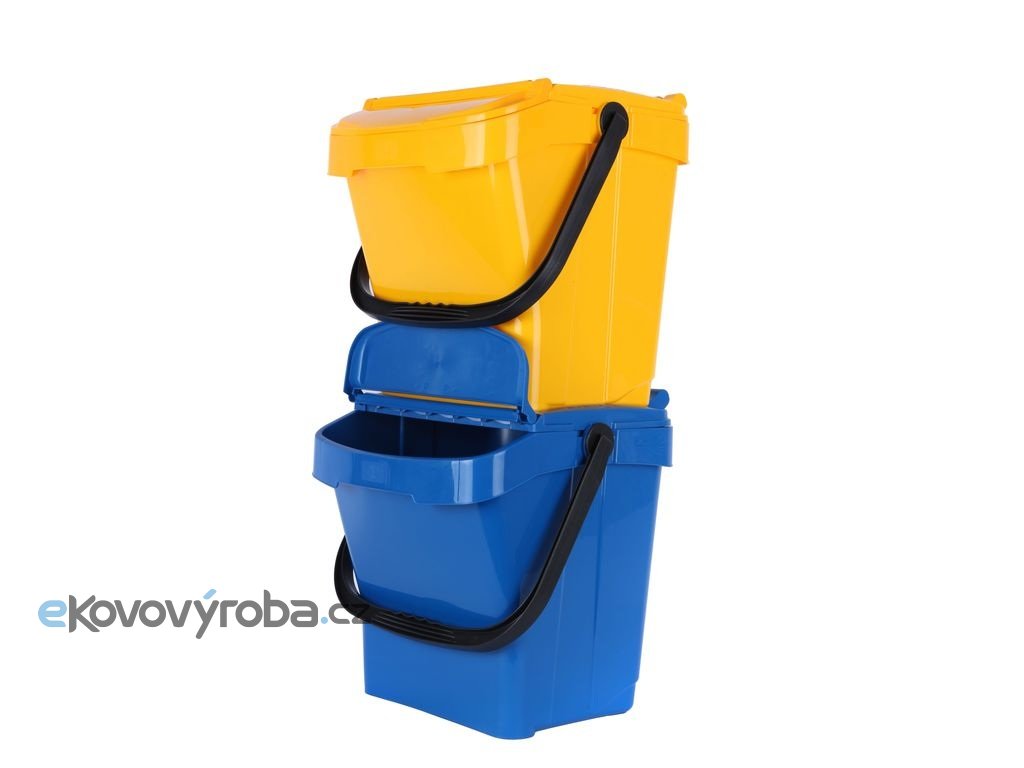 Barevné odlišení košů umožňuje snadnou orientaci při třídění odpadu: papír (modrá), plasty (žlutá), sklo (zelená), plechovky (červená), bio (hnědá).