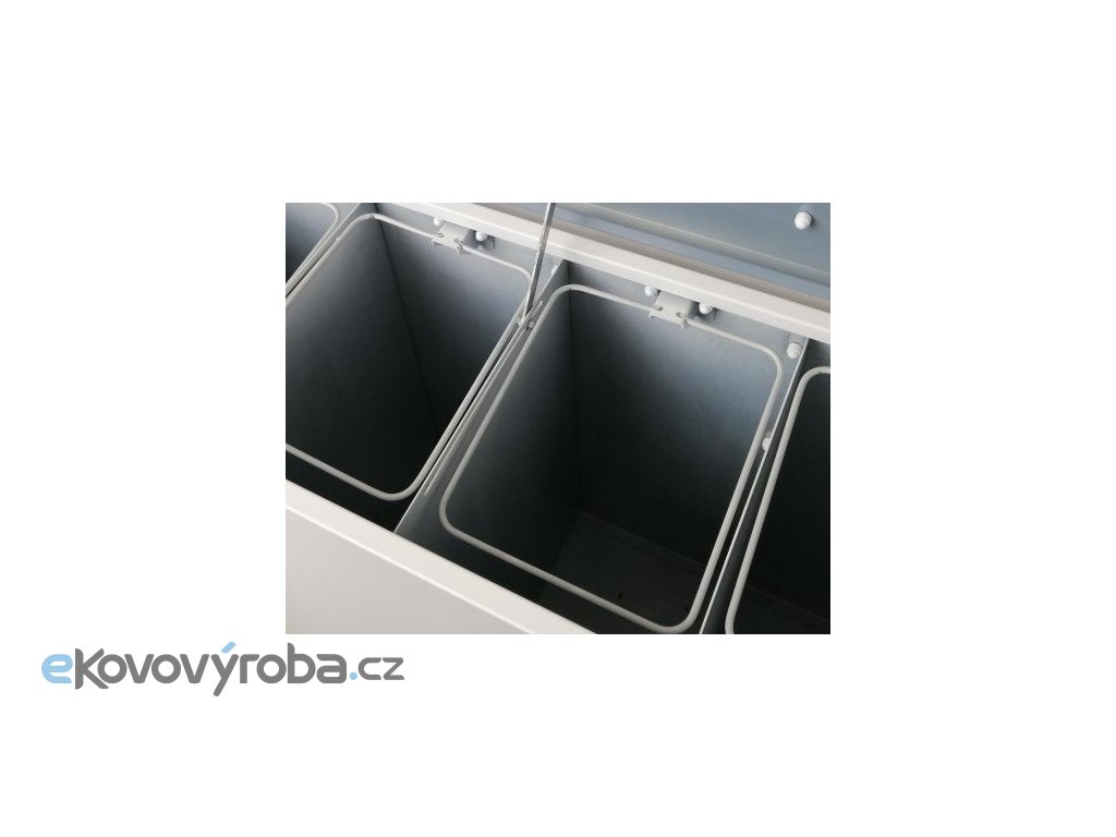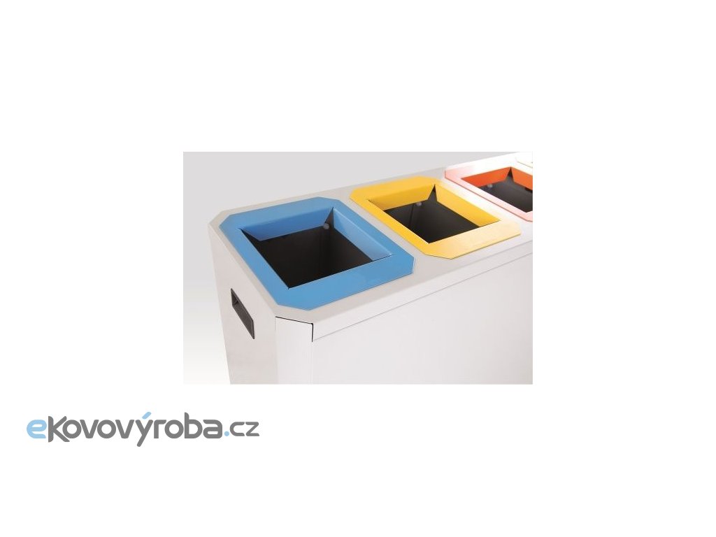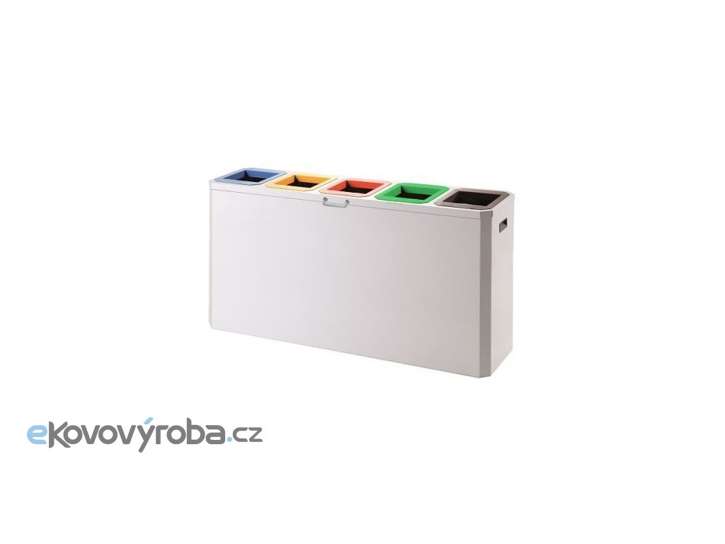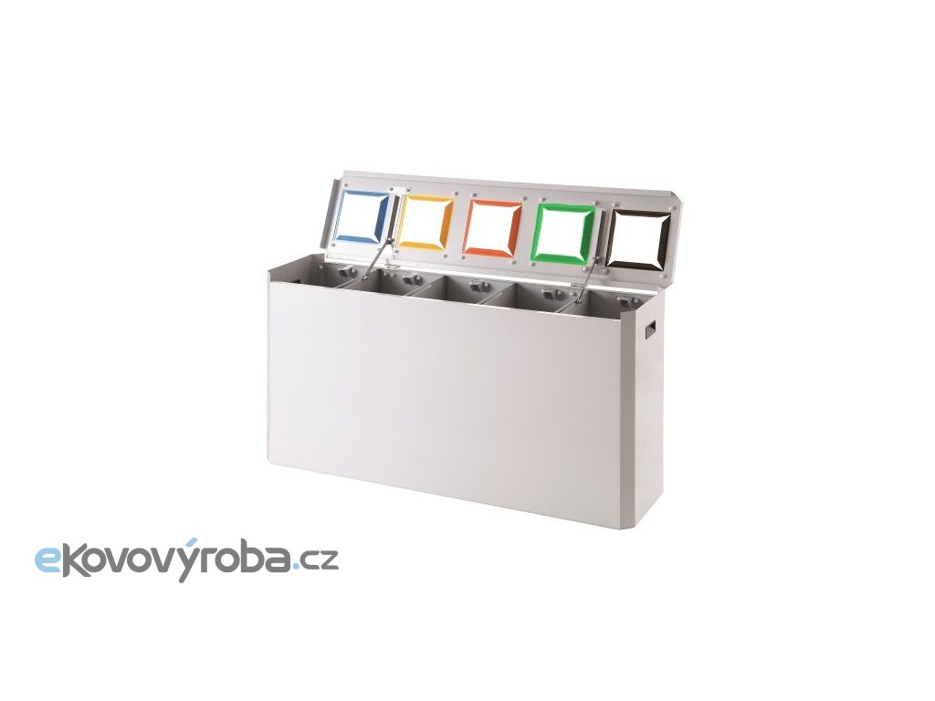 Vyrobeno z žárově pozinkovaného ocelového plechu. Povrchová úprava plechu provedena práškovou barvou. Verze s pěti oddělenými vhozy pro sběr tříděného odpadu. Nádoby jsou primárně určeny do vnitřních prostor. Tvořeno nádobou na odpad, víkem na pantech a límci (standardně dodáváno bez ražby na límci). V nádobě jsou oddělené šachty pro každý druh odpadu. Do šachty se vkládá igelitový pytel, který je zajištěn upínacím rámečkem. Nádoba je osazena plastovými nožkami a úchyty. Víko koše je vybaveno sklopným madlem. Barevné provedení límce koše dodáváno ve standardní nabídce barevného provedení Tělo / límec – Šedé / modré, žluté, červené, zelené, černé.