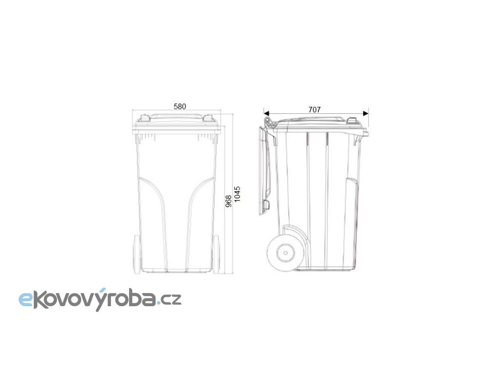 Plastová nádoba o objemu 240 l s víkem a dvěma kolečky.Vyrobeno z HDPE.V souladu s EN 840.Odolné vůči UV záření, chemickým a biologickým vlivům nebo mrazu.Hladké povrchy zabraňují ulpívání odpadu.Vybaveno bočními větracími otvory.Výrobní materiál neobsahuje kadmium a může být znovu granulován.