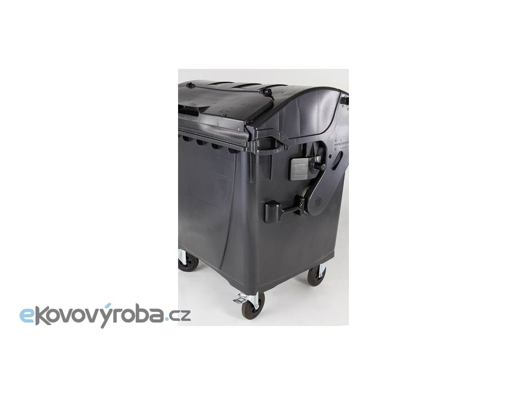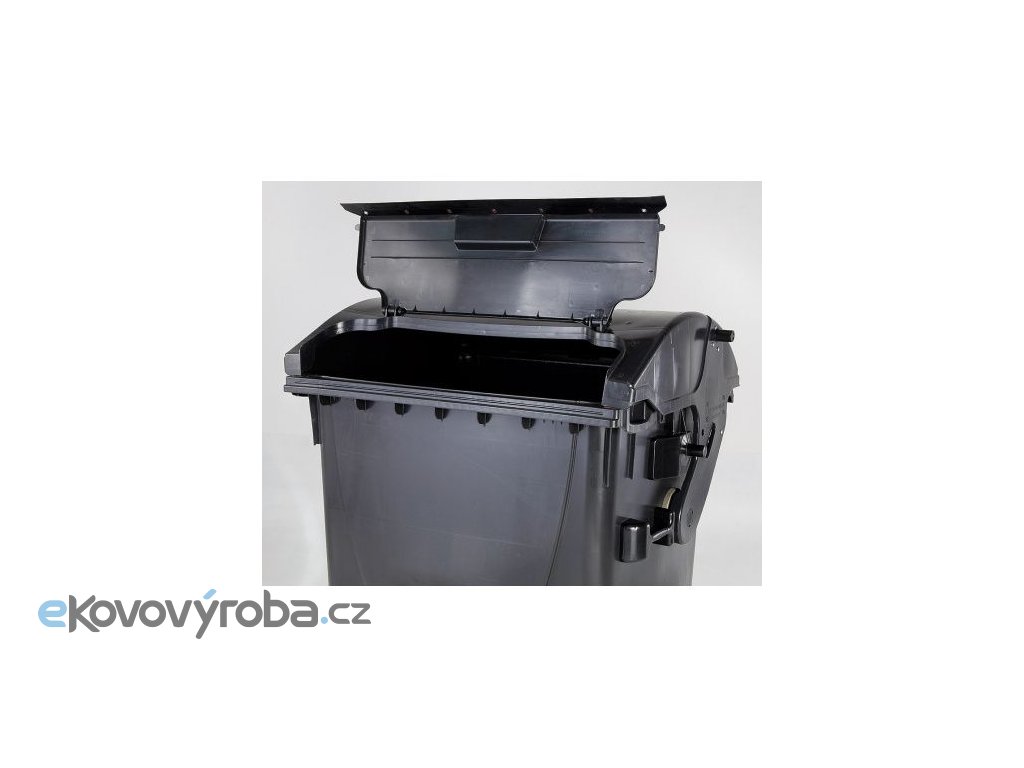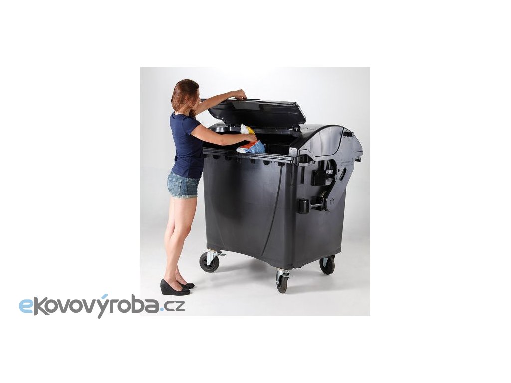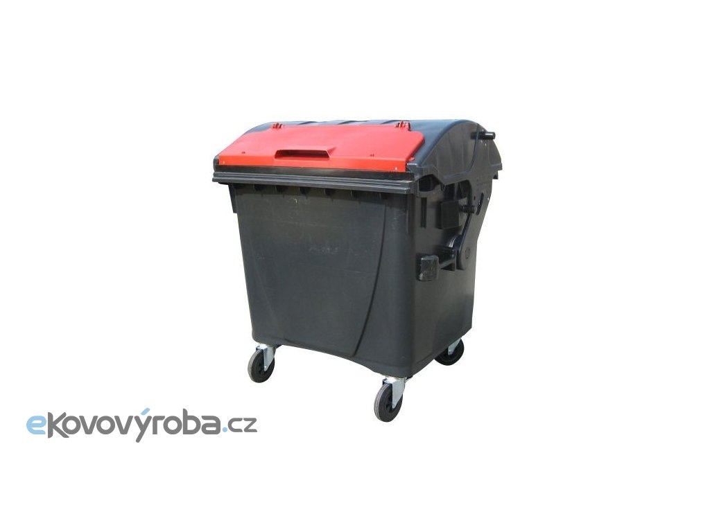 Plastový kontejner s kulatým víkem s víkem ve víku 1100 l. Vyrobeno z plastu – Polyetylen s vysokou hustotou (HDPE). Odklopné víko je opatřeno menším víkem – víko ve víku. Standardně dodáváno se dvěma bržděnými kolečky – průměr 200 mm. Možnost dodání s centrální brzdou. Max. možné zatížení – 510 kg. V souladu s EN 840. Odolné vůči UV záření, chemickým a biologickým vlivům nebo mrazu. Hladké plochy zabraňují ulpívání odpadu. Výrobní materiál neobsahuje kadmium a může být znovu granulován. Možnost dokoupení dětské pojistky.
