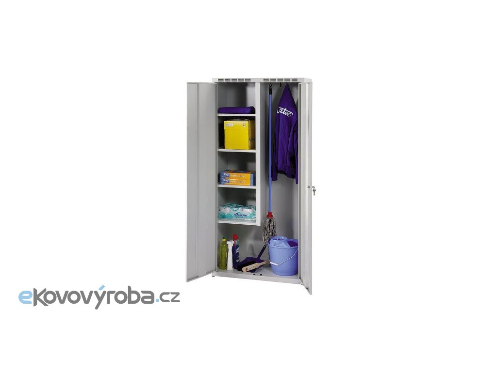Vyrobeno z ocelového plechu o tloušťce od 0,6 mm (plášť) do 1 mm (dno a vrchní část). Kvalitní svařovaná konstrukce. Účinný systém odvětrávání. Vhodné pro uložení čisticích prostředků. Vysoká odolnost proti násilnému vniknutí – dvou plášťová konstrukce dveří, dorazová plocha. Uzamykání skříně pomocí cylindrického zámku. Opatřeno kvalitní povrchovou úpravou – korpus RAL 7035, dvířka RAL 7035. Vybaveno bočními otvory pro spojení do řad. Vybaveno: 4x poličkou, tyčí na ramínka, 3x háčkem.