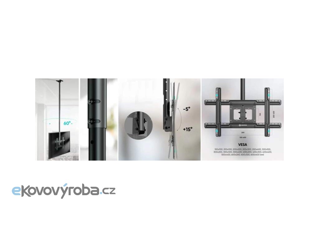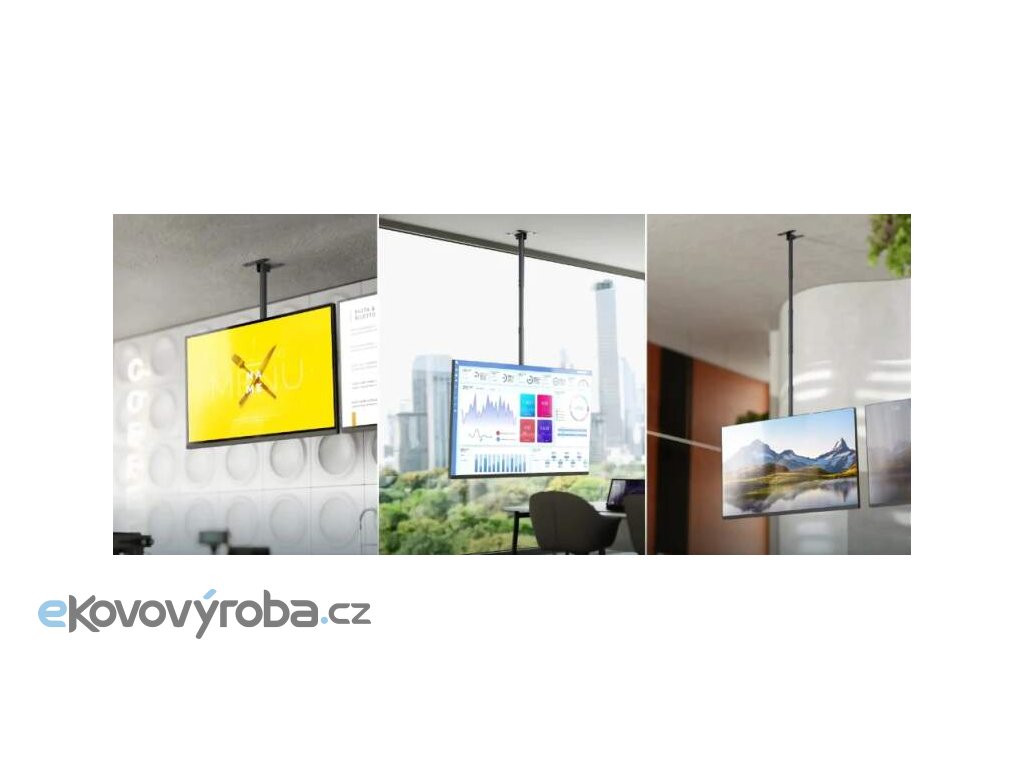 Kvalitní stropní držák na Tv monitor 32" - 80", nastavitelná délka 717-3104 mm, naklápění +5° / -15°, otáčení +30° / -30°, vedení kabeláže, instalační materiál, VESA standardy 100x100 až 600x400, nosnost 68,2 kg