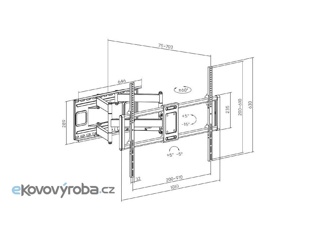 Držák na TV 60" - 120", otočný +60° / -60°, sklopný +5° / -15°, vzdálenost od zdi 75-703 mm, korekce roviny +5° / -5°, instalační plocha 646x289 mm, instalační materiál, šablona + vodováha, VESA standardy 200x200 až 900x600, nosnost 120 kg
