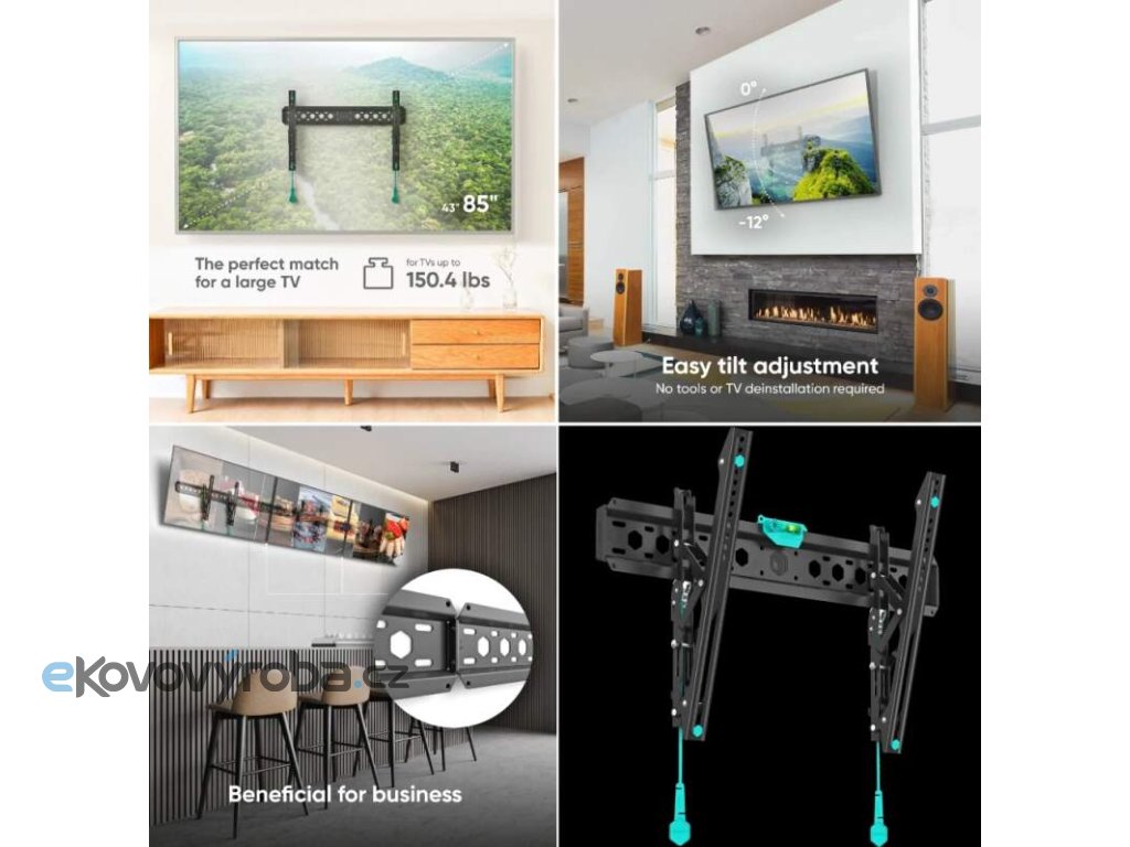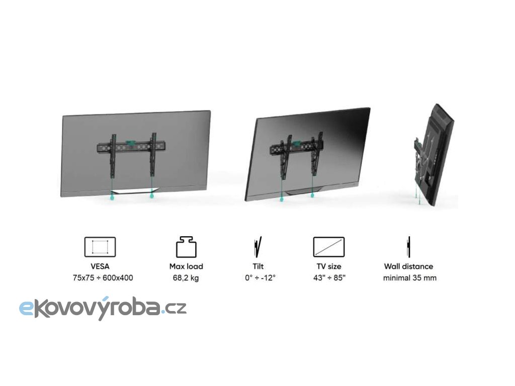 Nástěnný držák pro spolehlivé a bezpečné zavěšení televizorů, monitorů i displejů s úhlopříčkou 43" až 85" na zeď. Automatický systém zajištění obrazovky na držáku proti nechtěnému vysazení, uvolnění pomocí táhel, možnost naklápění od 0° až do -12°, vzdálenost od zdi 35 mm, rozměr základny 685x103 mm, pevná konstrukce, včetně instalačního materiálu, instalační šablony a vodováhy, podpora VESA standardů 75x75 až 600x400, nosnost 68,2 kg, záruka 5 let