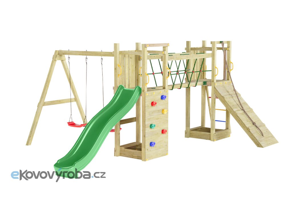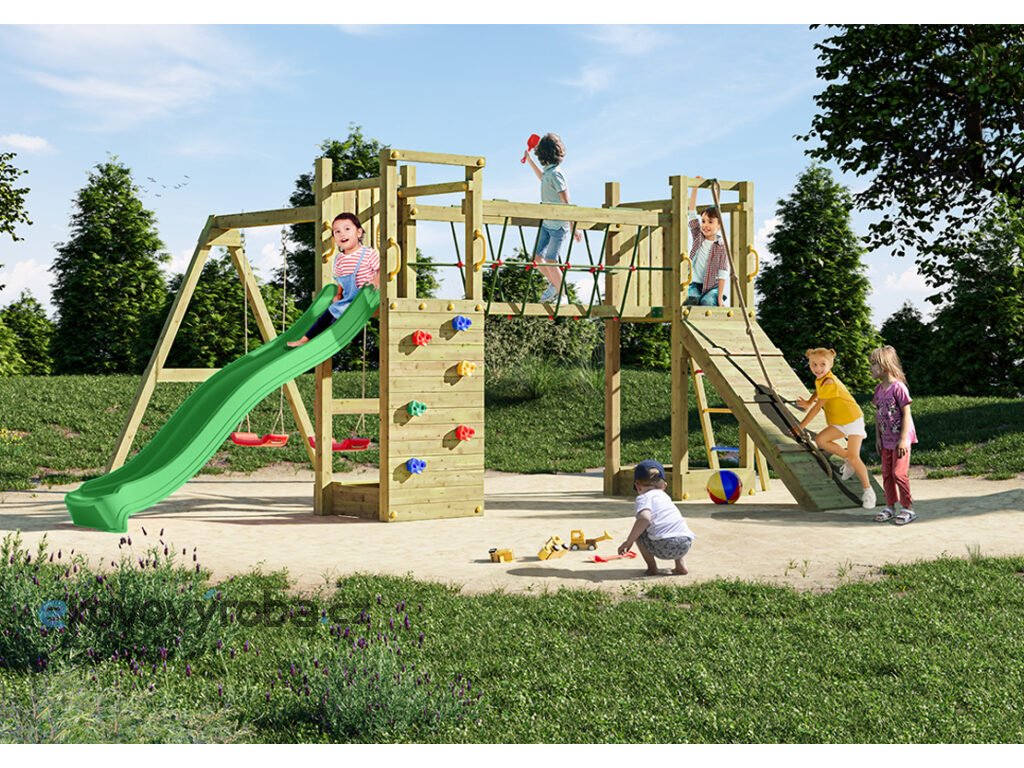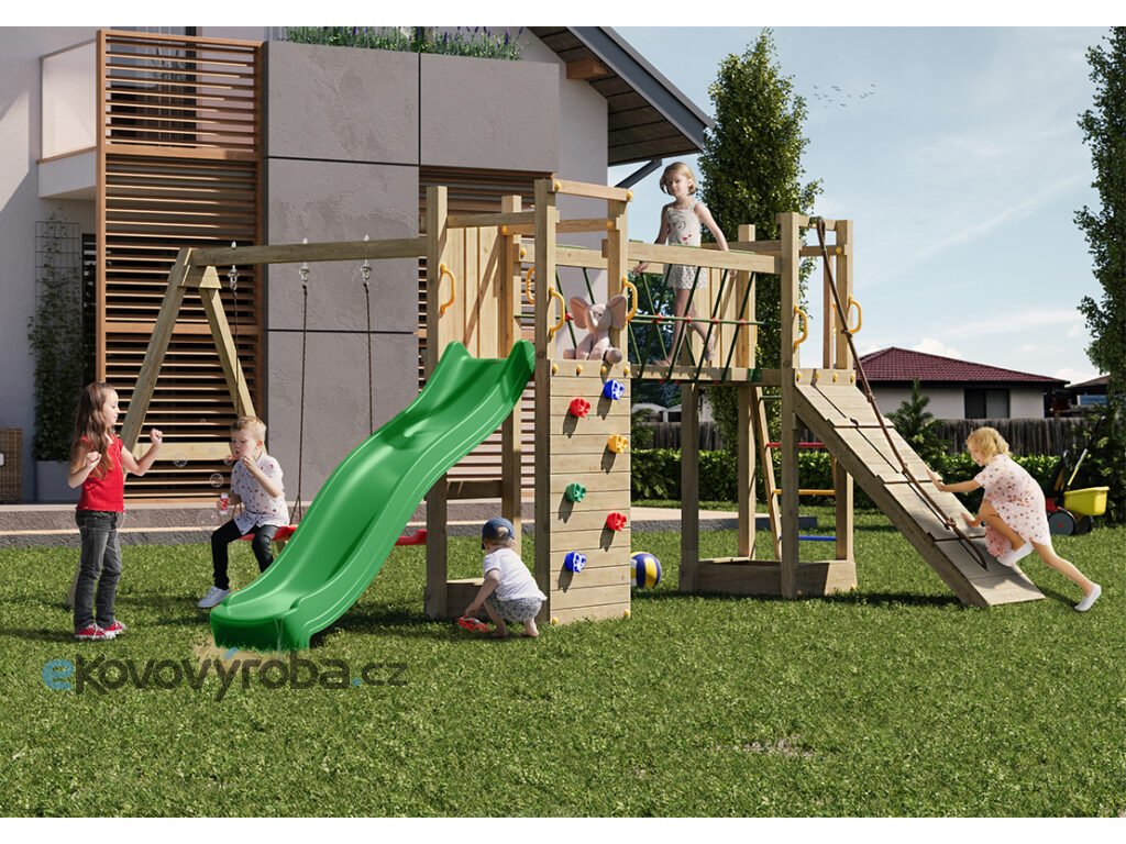 Velmi vybavené dětské hřiště Marimex Play Basic 010 nabízí všestranné vyžití pro vaše děti. Ve výbavě je krom oblíbené skluzavky například šikmá lezecká stěna s dřevěnými stupni a lanem, pískoviště, kolmá lezecká stěna se šplhacími kameny, piknikový stůl, můstek s ochrannými lany, žebřík a dvě houpačky. Dětská hřiště Marimex Play Basic jsou oproti klasickým Marimex Play rozměrově menší. Disponují impregnací KDI, neboli tzv. "zelenou impregnací". Certifikát FSC® Produkt disponuje certifikátem FSC®, který zaručuje, že při výrobě bylo šetrně zacházeno s přírodními zdroji. Organizace Forest Stewardship Council obecně podporuje ekologické, sociálně prospěšné a ekonomicky životaschopné obhospodařování lesů. Sada obsahuje: skluzavku 2,2 m s integrovanou přípojkou na vodu, barva zelená (obrázek na e-shopu je ilustrační, odstín barvy skluzavky se může nepatrně lišit) 10x kotvy upevňující sestavu k zemi madla a zábradlí 2x červené houpadlo na lanech s kotvami žebřík s kovovými příčkami šikmá lezecká stěna s dřevěnými stupni a lanem pískoviště kolmá lezecká stěna se šplhacími kameny piknikový stůl můstek s ochrannými lany Parametry: maximální zátěž: 450 kg určeno pro max. 9 dětí dřevěný materiál: borovice spojovací materiál: kov impregnace: KDI Výhody dětských hřišť Kvalitní materiály Veškeré komponenty jsou vyrobeny z robustního plastu, odolného kovu a borovicového dřeva, které je povrchově ošetřeno proti nepříznivým vlivům počasí. Zábava pro všechny Hřiště se skládají z rozličných prvků v podobě domečků, věží, skluzavek, houpaček, žebříků, lezeckých stěn, šplhacích lan a tyčí. Stačí si vybrat vhodnou sestavu podle věku dítěte. Bezpečnost Bezstarostné užívání je pro nás prioritou, proto všechna dětská hřiště prošla náročnými testy jakosti i bezpečnosti a splňují normy EN 71 Bezpečnosti hraček. Rozměry: rozměr celé sestavy: 525 x 398 x 210 cm výška podesty/plošiny: 125 cm Impregnace dřeva a ochranný nátěr Dřevo našich výrobků je ošetřeno tlakovou hloubkovou impregnací. Tato impregnace se někdy může na povrchu dřeva projevit zelenými či bílými skvrnami, které po určitém čase v důsledku klimatických podmínek zmizí a vzhled dřeva se sjednotí. Stejně tak se může v?balení objevit kondenzovaná vlhkost. V?obou případech se nejedná o výrobní vady, ale o normální technologický postup. Před sestavením produktu doporučujeme dřevo očistit jemným smirkovým papírem nebo suchým hadrem a natřít lazurou nebo barvou na dřevo. Vhodný přípravek vám doporučí v?každém hobbymarketu. Hřiště jsou určena pouze pro soukromé účely. Nesmí být využíváno pro komerční využití. Je určeno pro venkovní použití. Varování: Pouze pro domácí použití. Z bezpečnostních důvodů je potřeba sestavu řádně připevnit k zemi, a to např. kotvou, nebo betonáží.