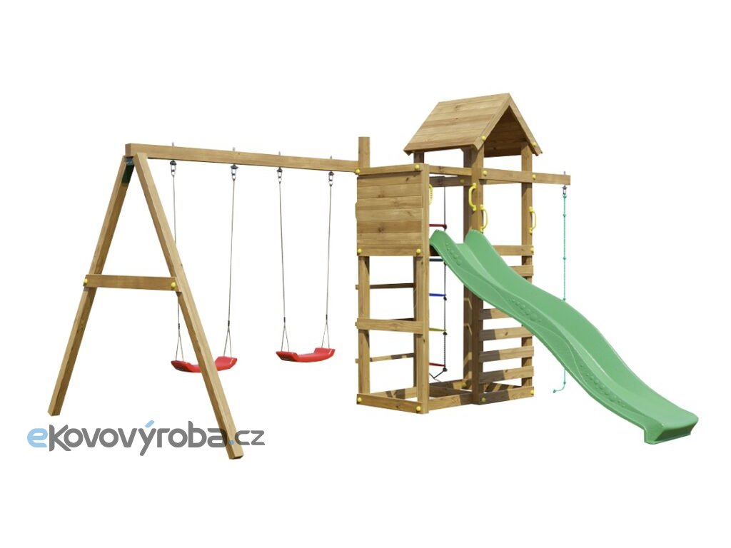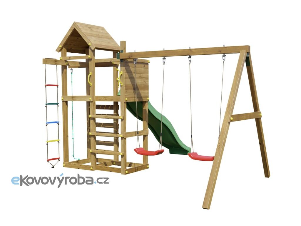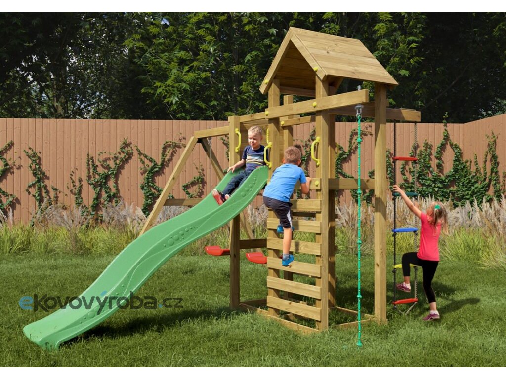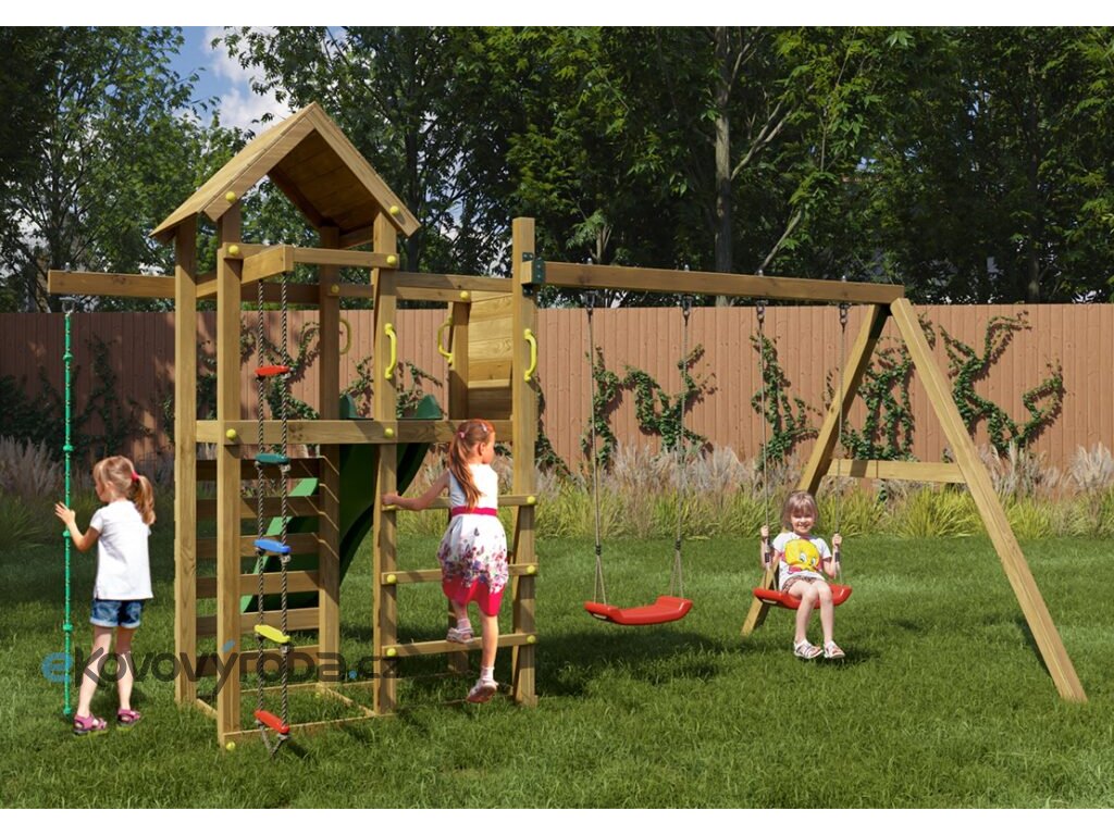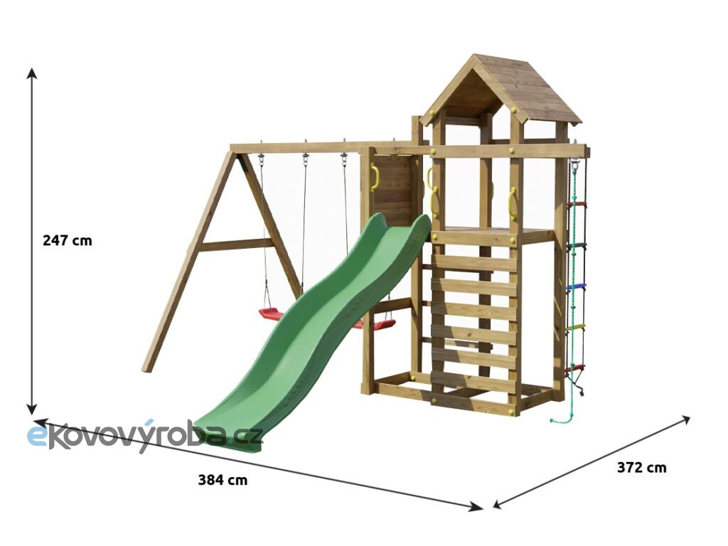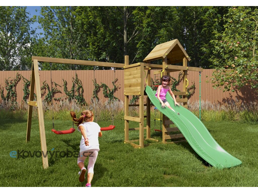 Popis produktu: Dětský set Marimex Play Basic 011 disponuje skluzavkou, houpadly na lanech, provazovým žebříkem s barevnými stupni a šplhacím lanem s uzly. Dětská hřiště Marimex Play Basic jsou oproti klasickým Marimex Play rozměrově menší. Disponují impregnací KDI, neboli tzv. "zelenou impregnací". Obsah balení: skluzavku 2,2 m s integrovanou přípojkou na vodu 6x kotvy upevňující sestavu k zemi madla a zábradlí 2x červené houpadlo na lanech s kotvami provazový žebřík s barevnými stupni šplhací lano s uzly s kotvou Parametry: maximální zátěž: 500 kg určeno pro max. 10 dětí dřevěný materiál: borovice spojovací materiál: kov impregnace: KDI Rozměry: rozměr celé sestavy - 372 x 384 x 247 cm rozměr podesty / plošiny - 126 cm Dřevo našich výrobků je ošetřeno tlakovou hloubkovou impregnací. Tato impregnace se někdy může na povrchu dřeva projevit zelenými či bílými skvrnami, které po určitém čase v důsledku klimatických podmínek zmizí a vzhled dřeva se sjednotí. Stejně tak se může v?balení objevit kondenzovaná vlhkost. V?obou případech se nejedná o výrobní vady, ale o normální technologický postup. Před sestavením produktu doporučujeme dřevo očistit jemným smirkovým papírem nebo suchým hadrem a natřít lazurou nebo barvou na dřevo. Vhodný přípravek vám doporučí v?každém hobbymarketu. Hřiště jsou určena pouze pro soukromé účely. Nesmí být využíváno pro komerční využití. Je určeno pro venkovní použití. Varování: Pouze pro domácí použití. Z bezpečnostních důvodů je potřeba sestavu řádně připevnit k zemi, a to např. kotvou, nebo betonáží.