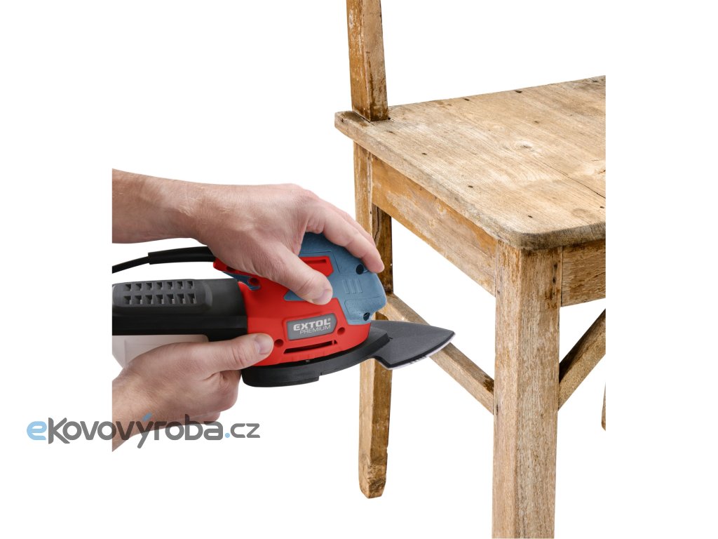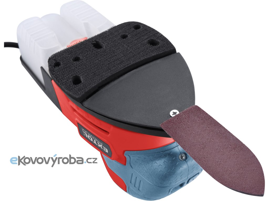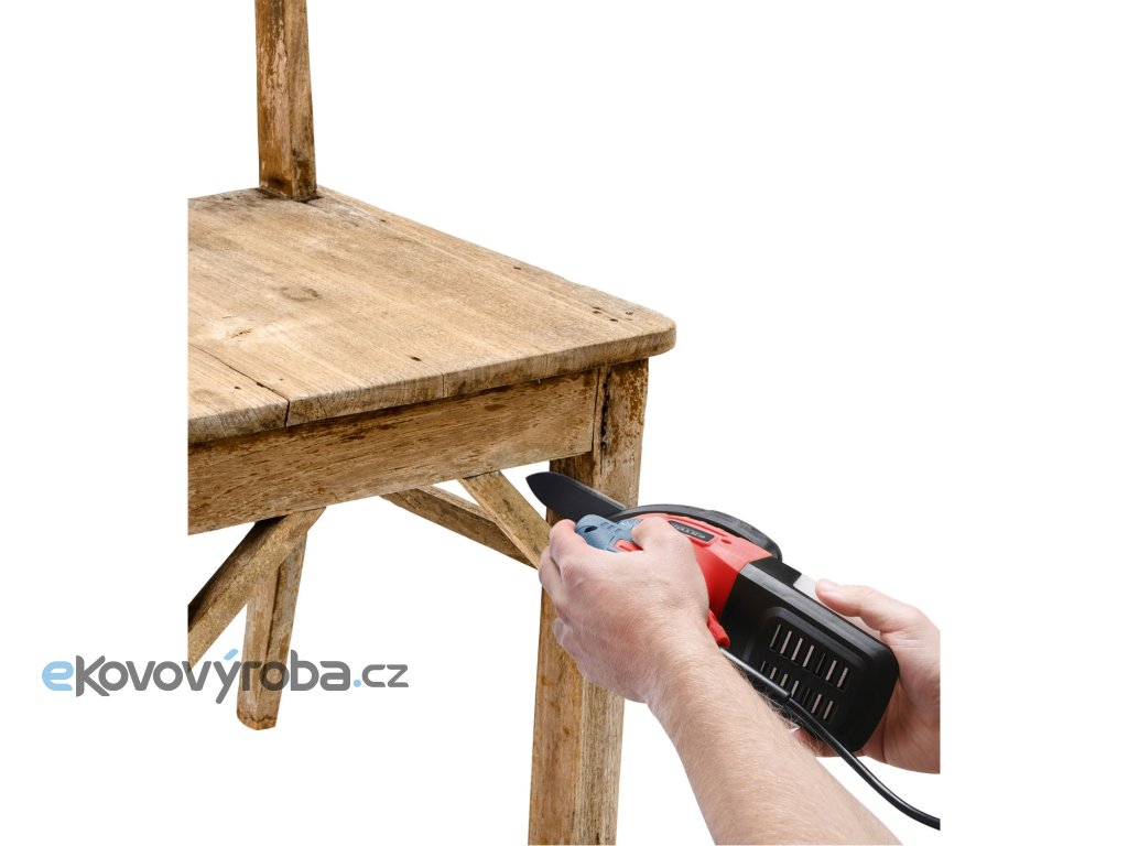 Vibrační bruska s uchycením brusného papíru na suchý zip je určena pro broušení dřeva a dřevěných materiálů, kovů a k zabroušení poškozených míst povrchové úpravy, např. barvy a laku, dále tmelů apod. bez použití vody.Na základnu brusky lze nainstalovat tři typy nástavců dle požadavku na dostupnost broušeného místa:1) Celá brusná plocha: je určena k broušení ploch. Na brusnou základnu lze dát brusný papír s jednou drsností nebo dvoudílný brusný papír s větší velikostí brusného zrna v přední části pro obroušení a s menší velikostí zrna v zadní části pro zabroušení. 2) Nástavec trojúhelník: pro broušení drážek a úzkých míst s většími plochami, např. boky prken v plotu...3) Nástavec brusný prst: pro broušení úzkých ploch, kde není možné broušení větším nástavcem a v místech, kde se není možné dostat kvůli velikosti brusky.Bruska není vhodná pro broušení sádrokartonu.