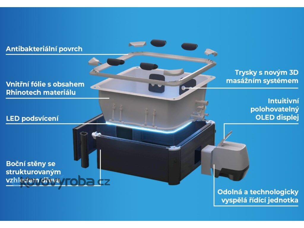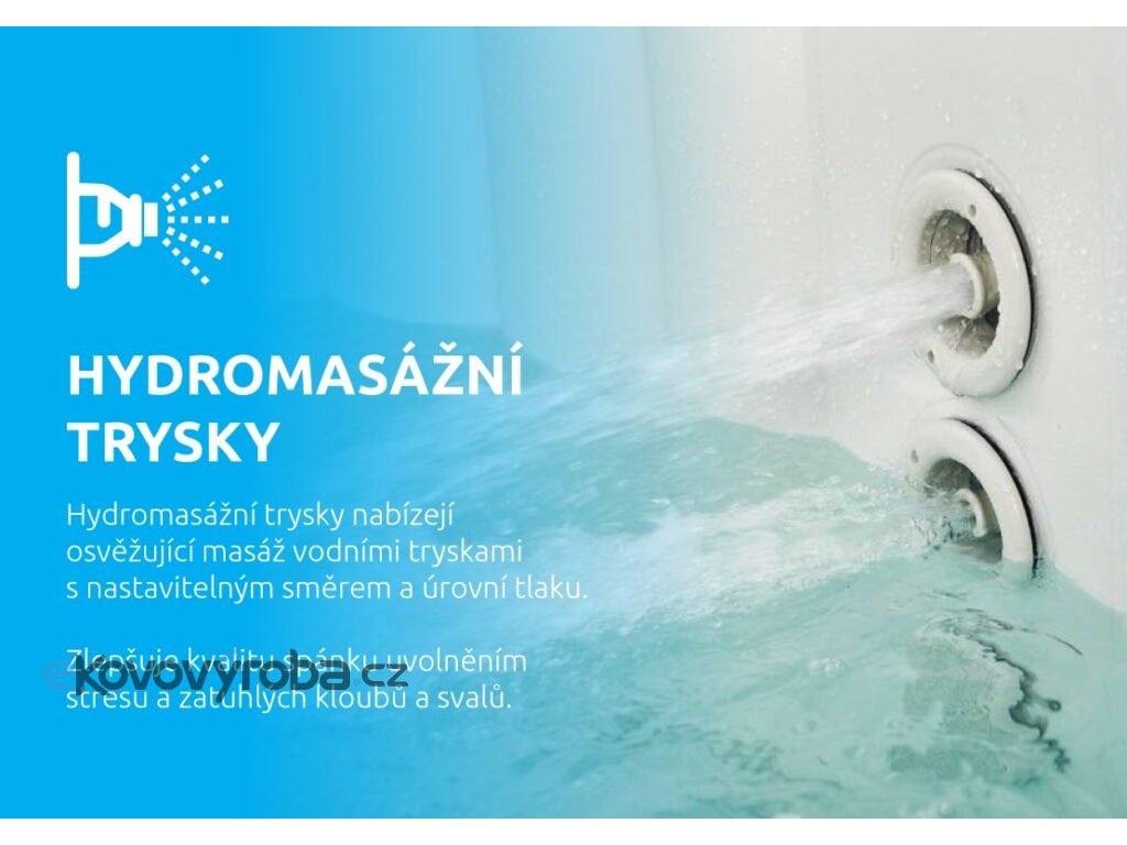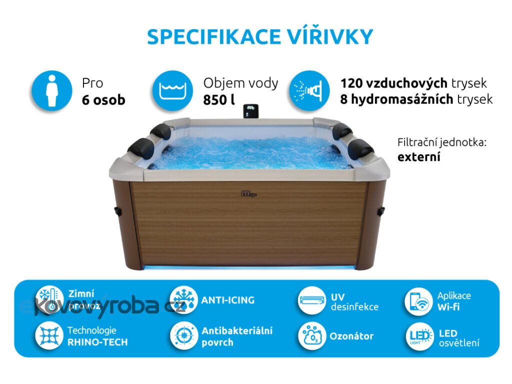 - Trysky: 120 vzduchových + 8 nastavitelných hydromasážních trysek