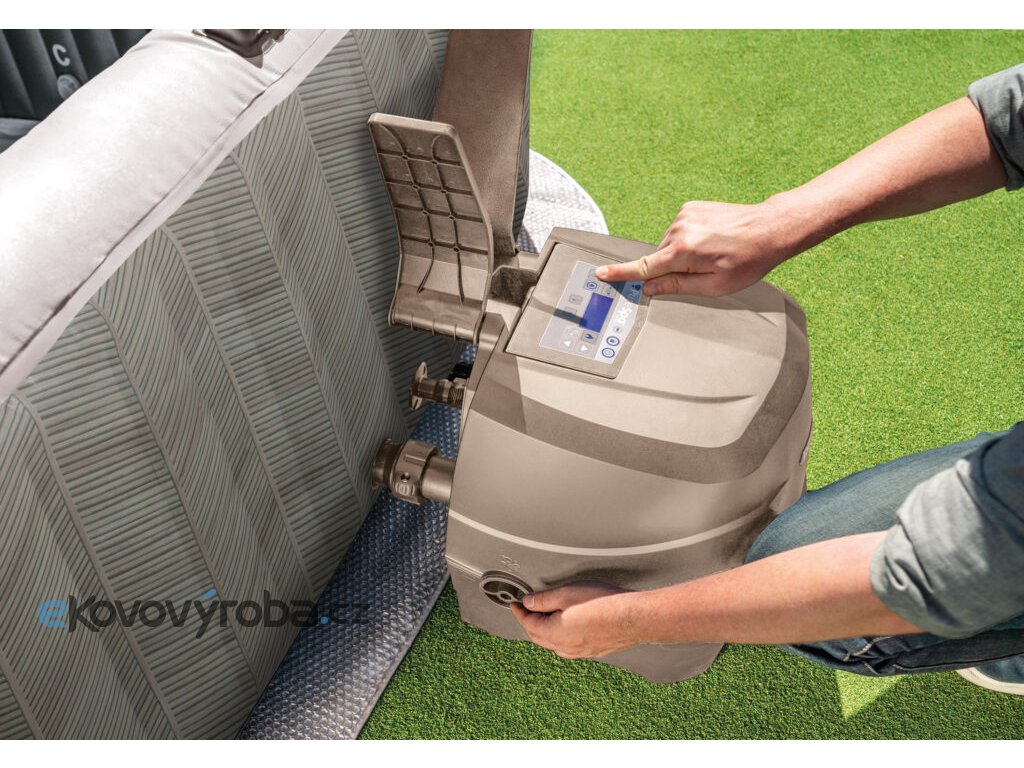 Popis produktu:Vířivá vana Pure Spa Chevron Deluxe 4 NP poskytuje dokonalou relaxaci ihned po stisknutí jediného tlačítka. Prostorově je řešená až pro čtyři osoby. Intuitivní ovládací panel aktivuje 140 vysoce výkonných bublinkových trysek, které masáží povzbudí každý sval. PureSpa vyžaduje jednoduchou a rychlou údržbu. PureSpa umožňuje dokonale relaxovat v každém ročním období. Vana je vyrobena z vysoce kvalitního laminovaného PVC. Samozřejmostí je unikátní systém HWT na změkčování vody a systém SWT (salt water) na slanou vodu. Ovládání vířivky pomocí aplikace v mobilu: Vířivka má zabudovaný wi-fi modul, díky jeho propojení s mobilní aplikací z Google play / App store si můžete všechny funkce a nastavení ovládat na dálku odkudkoliv. Dokonalou relaxační lázeň tak stihnete připravit ještě před Vaším příchodem. Systém HWS na změkčování vody: Unikátní systém HWS (Hard water Treatment System) změkčuje vodu, která je tak příjemnější a šetrnější k vaší pokožce. (*Pro tento systém se používá zkratka HWS nebo HWT.) Elektronická jednotka vytváří střídavé magnetické pole, které vytváří elektrické pole ve vodě a zabraňuje tak vzniku vodního kamene v hadicích.VÝHODY:1. Zabraňuje dalšímu vytváření vodního kamene2. Voda je měkčí3. Zmírňuje vliv vodního kamene na kůži a oděvy Systém SWT (salt water) na slanou vodu: Vířivka je vybavena vestavěným solinátorem, který nahrazuje chlor jednoduchou nejodizovanou solí, která je šetrnější k lidské pokožce. Parametry vířivky: Počet osob: 4 dospělé osoby Vnitřní průměr: 124 cm Vnější průměr: 175 cm (po naplnění vodou, tolerance ± 5%) Výška: 71 cm Objem vody: 795 l Trysky: 140 vzduchových trysek Filtrační jednotka: externí Teplotní rozpětí ohřevu: 10°-40° Příkon ohřevu vody: 2 200 W Váha bez vody / s vodou: 61 kg / 856 kg Výkon perličkové masáže: 800 W Napájení: 220-240V / 50Hz Rychlost ohřevu vody: 1,5 – 2,5°C /hod Cirkulační čerpadlo: 1 741 l/hod solinátor: 20 W Řídící a filtrační jednotka není zabudována do pláště vířivky Vlastnosti vířivky: Materiál vany: Laminované PVC Konstrukce vany: 47 FIBER-TECH BEAMS (silná polyesterová vlákna) Tloušťka materiálu: 0,84 mm Délka přívodního kabelu: 5 m Příslušenství SPA (obsaženo v balení vířivky): vířivý bazén termoizolační kryt ohřev/filtrační systém/pumpa trysek 2x filtrační vložka izolační podložka hadice pro nafukování přepravní taška tester na volný chlor, pH a celkovou zásaditost přívodový kabel o délce 5m K vířivce nelze připojit solární ohřev, chlorinátor ani písková filtrace.