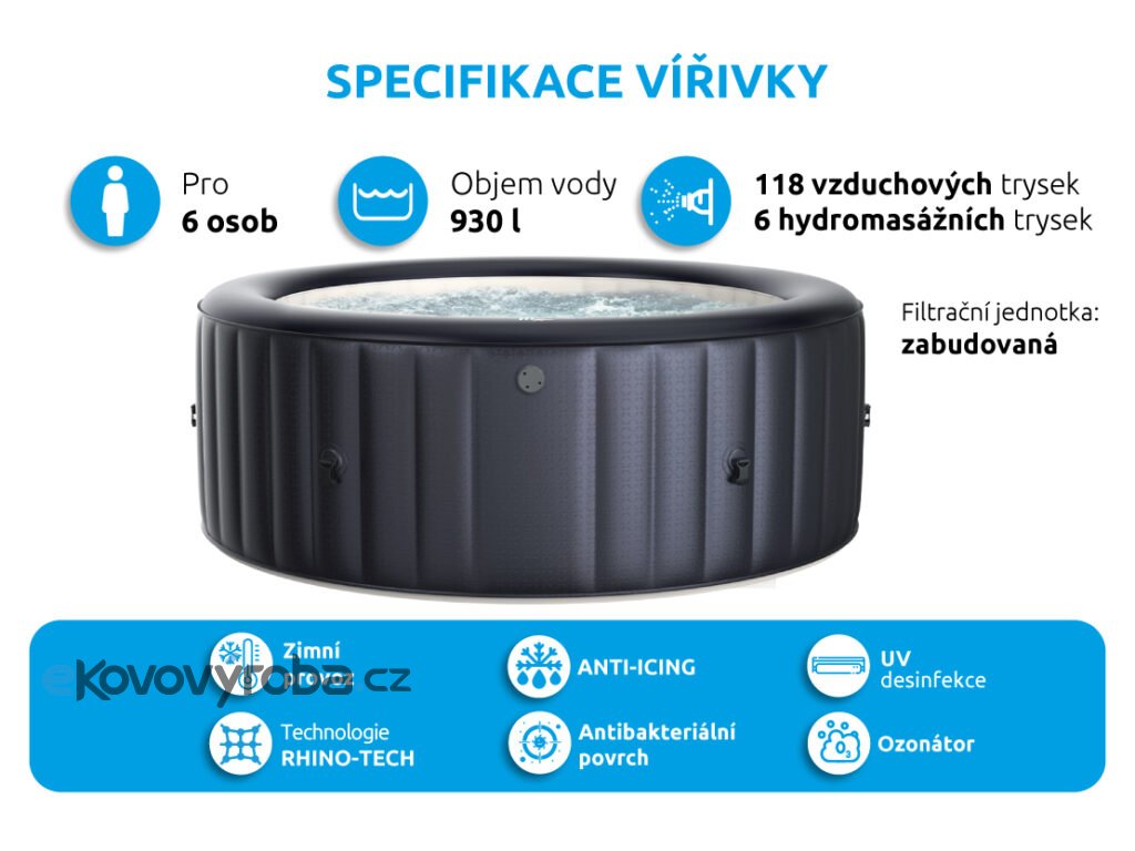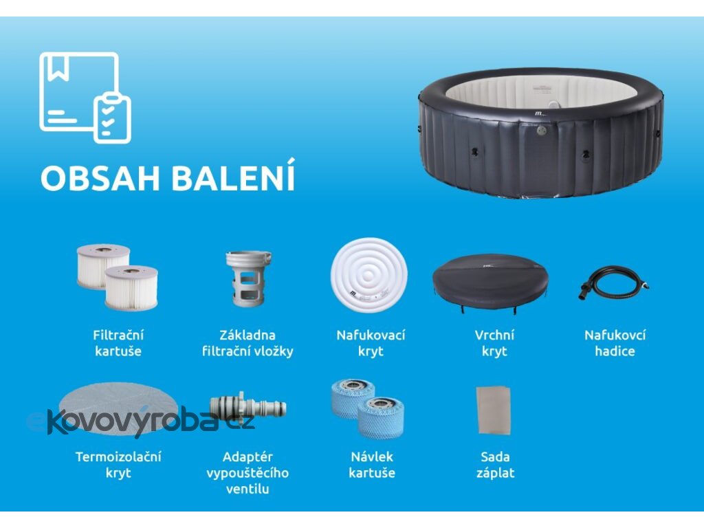 Popis produktu: Nafukovací vířivka Carlton M-CA062 má ve výbavě 6 hydromasážních trysek, které nabízejí osvěžující masáž s nastavitelným směrem a úrovní tlaku. Dno vnitřní folie vířivé vany je pokryto pravidelně rozmístěnými výstupky, které poskytují dodatečné tření a zabraňují uklouznutí při vstupu do vany a výstupu z ní. Parametry vířivky: Počet osob: 6 dospělých osob Vnitřní průměr: 160 cm Vnější průměr: 204 cm (po naplnění vodou, tolerance ± 5%) Výška: 70 cm Objem vody: 930 l Trysky: 118 vzduchových trysek + 6 Hydro-jets trysek Masáž vzduchovými tryskami - 360 stupňový systém vzduchových trysek plní vířivou vany tisícovkami vzduchových bublinek, rovnoměrně rozmístěné trysky vypouštějí bublinky směrem do středu vířivé vany, čímž vytvářejý rovnoměrný celotělový relaxační zážitek Hydromasážní trysky nabízejí osvěžující masáž vodními tryskami s nastavitelným směrem a úrovní tlaku. Zlepšuje kvalitu spánku uvolněním stresu a zatuhlých kloubů a svalů, což snižuje nepohodlí v nočních hodinách. Řada Muse nabízí 3 sady (6 vodních trysek) po obvodu vířivé vany. Filtrační jednotka: zabudovaná Teplotní rozpětí ohřevu: max. 40° Příkon ohřevu vody: 2 200 W Výkon perličkové masáže: 720 W Variabilní rychlost bublinek: úroveň 1: 300W úroveň 2: 500W úroveň 3: 720W Napájení: 220-240V / 50Hz Rychlost ohřevu vody: 1,2 – 1,8°C /hod Filtrační čerpadlo: 600 W / 1 800 l /hod Délka napájecího kabelu: 5 m Řídící a filtrační jednotka je zabudována do pláště vířivky Vlastnosti: Barva skořepiny: modrá Vnější materiál: RhinoTech Prémiové PVC - odolné a stálé, šedá barva UV lampa SMART filtrační systém ANTI-ICING Antibakteriální povrch Energy Saving Timer Whisper Quiet Tech Protiskluzové dno Ozonátor (5,5 W, 30-50 mg/hod.) Nafukovací kryt Funkce rychlonafukování M-one Dálkové ovládání MUSE Zimní provoz UV lampa Uvnitř ovládací jednotky je zabudovaná mini sterilizační komora s UVC LED lampou, která zajišťuje, že každá kapka vody v Mspa je pod neustálou ochranou - bez ohledu na to, jestli se v ní zrovna koupou lidé nebo ne. Testy ukazují, že tato lampa dokáže za 4 hodiny zahubit 52% bakterií. UV LED lampa nemůže poškodit vaše oči ani pokožku, jelikož je kompletně uzavřena uvnitř čerpadla. Narozdíl od UVA nebo UVB záření UVC nemá vliv na životnost. Vlnová délka UVC záření je pečlivě nastavena tak. aby neovlivnila životnost ostatních částí vany. Spotřeba tohoto UVC systému je velice nízká. SMART filtrační systém Filtrační systém SMART vás upozorní na výměnu nebo vyčištění kartuše. ANTI-ICING Úplně nový systém ANTI-ICING bude neustále dohlížet na vaši vířivou vanu a hlídat bezpečnou úroveň teploty. Pokud teplota vody poklesne pod 1°C, ohřev se automaticky spustí, dokud teplota vody nestoupne na 3°C. Toto zabrání vodě v zamrznutí a ochrání tak cirkulační systém, čerpadlo a trubky před poškozením. Při poklesu teploty venku pod 4°C je nutné před nafouknutím nechat plášť vířivky aklimatizovat v teplé místnosti po dobu 24 hod. Po nafouknutí je nutné ji ihned napustit vodou a zapnout ohřev. Antibakteriální povrch Vnitřní folie vířivé vany obsahuje antibakteriální tkaninu, která uvolňuje baktericidní složku, která v souladu s ISO 22196:2011 standardem snižuje množení bakterií o 99%. Energy Saving Timer Chcete mít k dispozici hřejivou a útulnou vířivou vanu přesně kdy potřebujete? Žádný problém. Nyní si můžete nastavit čas, kdy se má vířivka vzbudit a začít se nahřívat. Za pomoci nově vyvinutého integrovaného čipu ovládací panel umožňuje uživateli nastavit čas, kdy se má zapnout vyhřívání po dobu následujících 99 hodin. Whisper Quiet Tech Na rozdíl od ostatních značek vířivých van, Mspa má velice tichý motor. Uložení ovládací jednotky uvnitř těla vířivky ve spojení s hluk absorbující pěnou dokáže redukovat hluk na úroveň nesrovnatelnou s konkurenčními produkty. Protiskluzové dno Dno vnitřní folie vířivé vany je pokryto pravidelně rozmístěnými výstupky, které poskytují dodatečné tření a zabraňují uklouznutí při vstupu do vany a výstupu z ní. Ozonátor Jednoduše zapněte ozonový generátor stisknutím tlačítka Ozone na ovládacím panelu před použitím vířivky nebo po něm. Udržíte tak svou vířivou vanu a sebe během relaxace v perfektním stavu. Ozón je velice účinný dezinfektant, který zabíjí bakterie, viry a mikroby. Je 50x účinnější než chlor a dokáže také odstranit zápachy a pomáhá změnit zakalenou vodu na průzračně čistou. Funkce rychlonafukování M-one Od vybalení vířivky do její kompletní instalace vám stačí jediný krok - stisknutí jednoho tlačítka. Na rozdíl od předchozí verze instalac není třeba otáček knoflík, není třeba dlouze držet tlačítko, není třeba kontrolovat tlak na manometru. Vířivka se sama začne nafukovat a sama skončí po dosažení optimálního tlaku. Můžete jednoduše stisknout tlačítko a odejít. Není tu riziko přefouknutí, jelikož integrovaný tlakoměr nepřetržitě monitoruje tlak vzduchu a automaticky zastaví nafukování při dosažení optimálního tlaku. Zimní provoz Provoz vířivky je garantován až do teploty -5 °C. Nízkým teplotám jsou přizpůsobeny jak materiály vířivky a ovládacích prvků, tak i funkce ve spojení s provozními procesy systému. Pro dokonalý požitek z relaxace v zimě stačí vířivku udržovat aktivovanou a pokud se nepoužívá, zakrýt ji plášťovým i nafukovacím krytem. Při poklesu venkovní teploty pod 0 °C je před nafouknutím potřeba nechat plášť vířivky aklimatizovat v teplé místnosti po dobu 24 hodin. Po vynesení vířivky ven, j