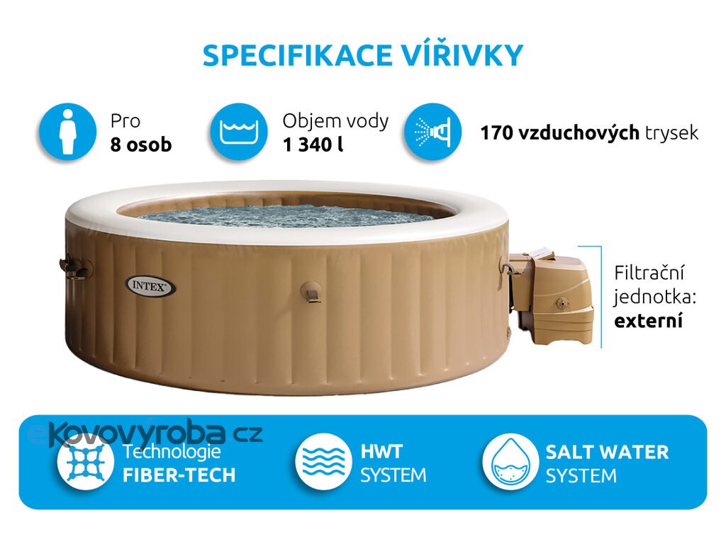 - Balení: Vířivý bazén,termoizolační kryt, ohřev/filtrační systém/pumpa trysek, 2x filtrační vložka, izolační podložka, hadice pro nafukování, taška, malý plovák na bazénové minitablety, tester na volný chlor, pH a celkovou zásaditost, přívodový kabel o délce 5 m