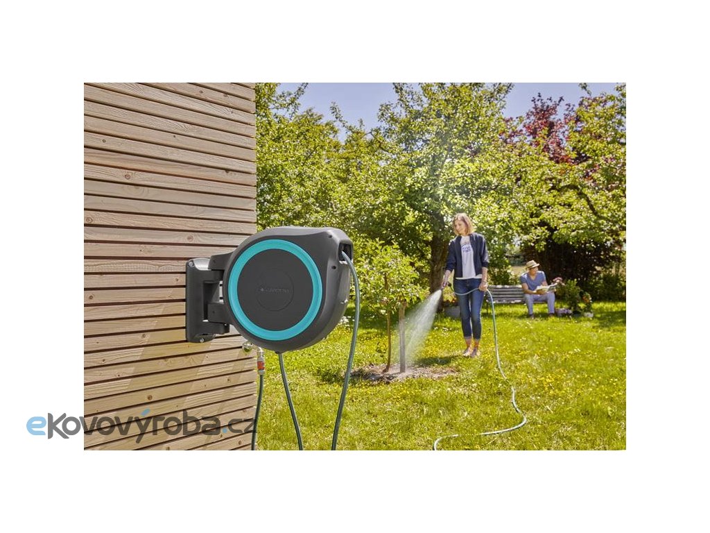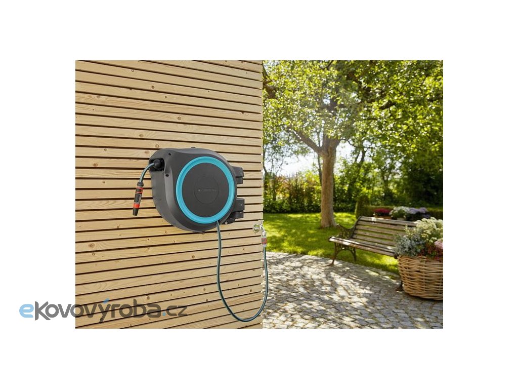 Lehkým zatažením za konec hadice se zámek uvolní a zabudovaná ocelová pružina s inovativní technologií RollControl navine plynule a kontrolovaně hadici zpět do boxu. RollControl chrání box na hadici a okolí před poškozením způsobeným příliš rychlým vtažením. Aby nedocházelo k zalomení nebo zauzlení hadice na vodu, disponuje box integrovaným vedením hadice.