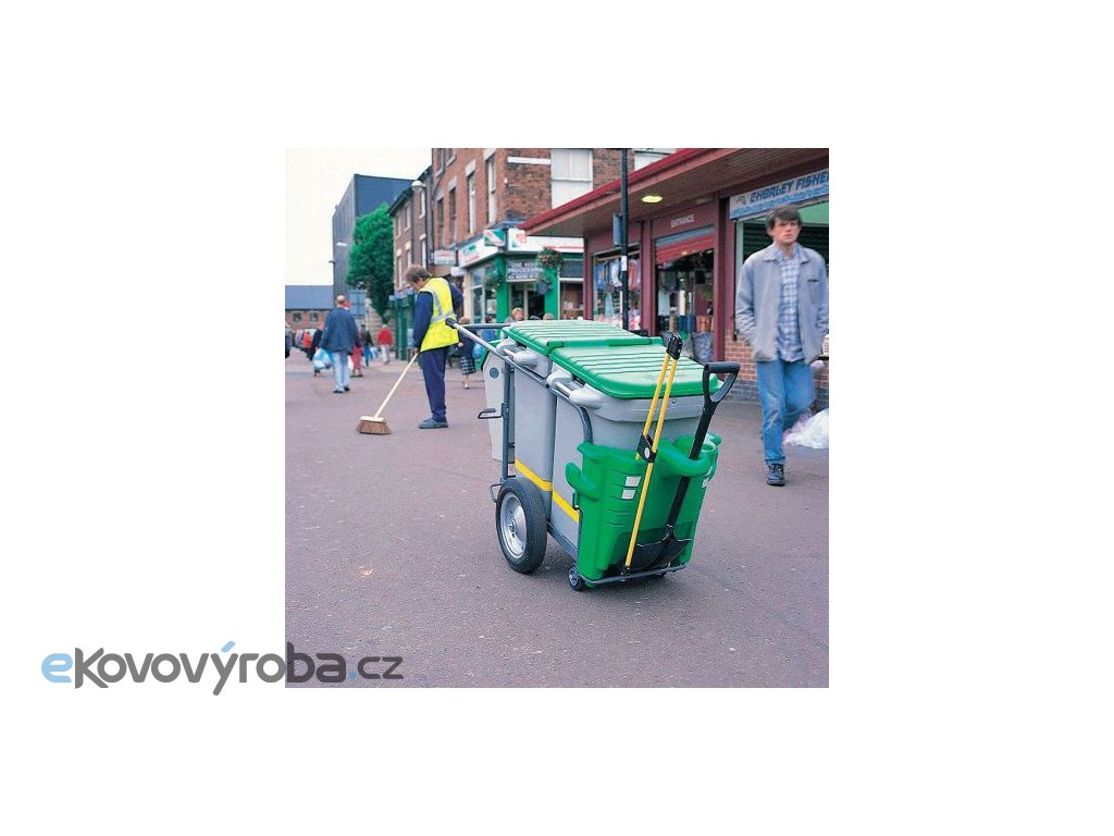 Vyrobeno z plastu Durapol.Profesionální vozík s kovovou konstrukcí s gumovou obručí.Vybaven dvěma velkoobjemovými nádobami s víkem, držákem nářadí a závěsným odpadkovým košem s víkem.
