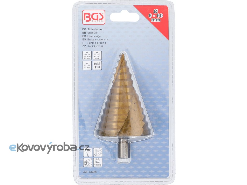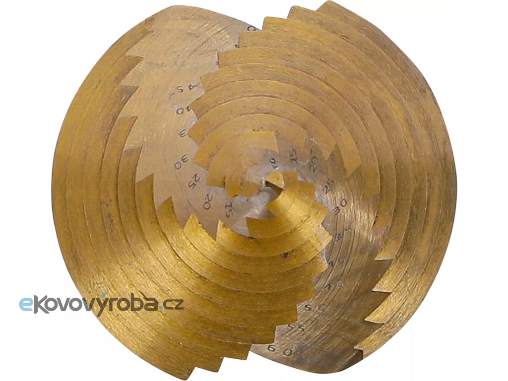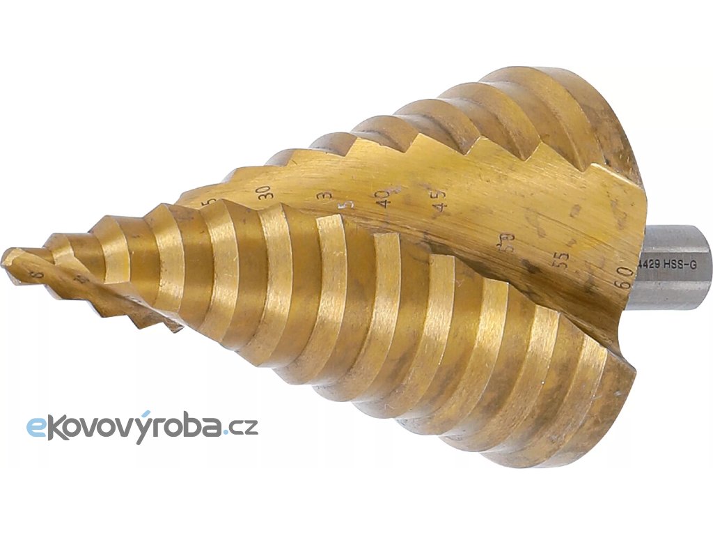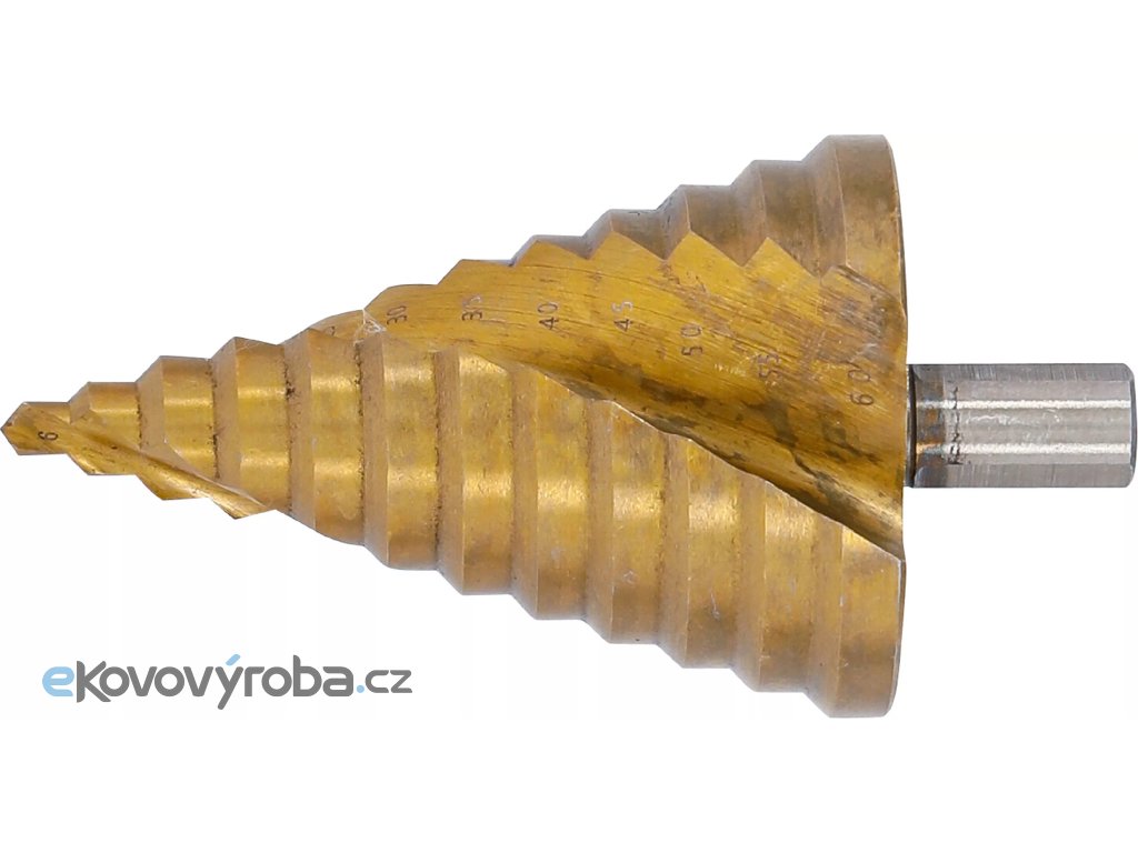 Stupňovitý vrták s titanem nitridovaným povrchem je navržen pro precizní práci s tenkými materiály z ocelového plechu, plastu a neželezných kovů.