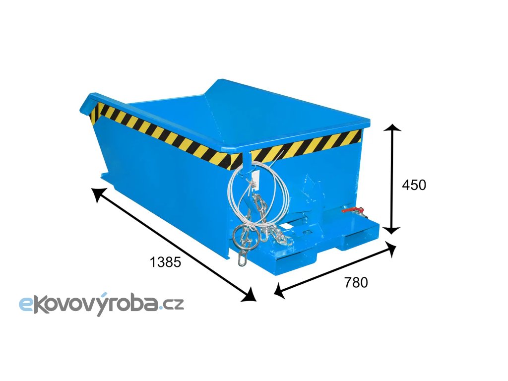 Výklopný kontejner MINI s výpustí o objemu 270 l v barvě modrá je vyroben z ocelového plechu o tloušťce 3 mm. Kontejner má mechanismus pro kolmé vyklápění, díky tomu dojde k úplnému vysypání nákladu. Vyklápění je možné provádět v jakékoli výšce vidlí VZV z kabiny řidiče pomocí ocelového lanka. Přebytečná kapalina z nákladu zbavená větších mechanických nečistot díky separačnímu dnu může odtéci výpustí. Spoje kontejneru jsou vodě a oleji odolné. Maximální zabezpečení již ve standardním vybavení díky řetězu proti sklouznutí z VZV a pojistce proti neúmyslnému vyprázdnění. |