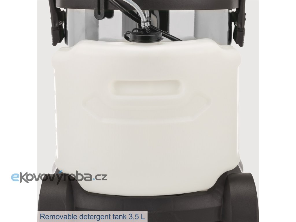 Zařízení je vybaveno praktickou hadicí, která umožňuje snadné stříkání i odsávání a odnímatelnou nádržkou na vodu a čisticí prostředek s kapacitou 3,5 litru. Odpadní voda je shromažďována v odolné nerezové nádrži o objemu 20 litrů. Ta má boční uzávěry a praktickou výpusť na špinavou vodu. Výkonný motor o síle 1600 W poskytuje dostatek energie i pro náročné úkoly. Pro pohodlnou práci má stroj pracovní dosah až 9,5 m, a to díky 2 m sací hadici s otočným adaptérem a 7,5 m přívodnímu kabelu. Integrovaný držák na kabel a příslušenství zajišťuje pořádek během práce i skladování. Sklopná rukojeť a čtyři hladce se pohybující kolečka umožňují snadný pohyb po jakémkoliv povrchu.