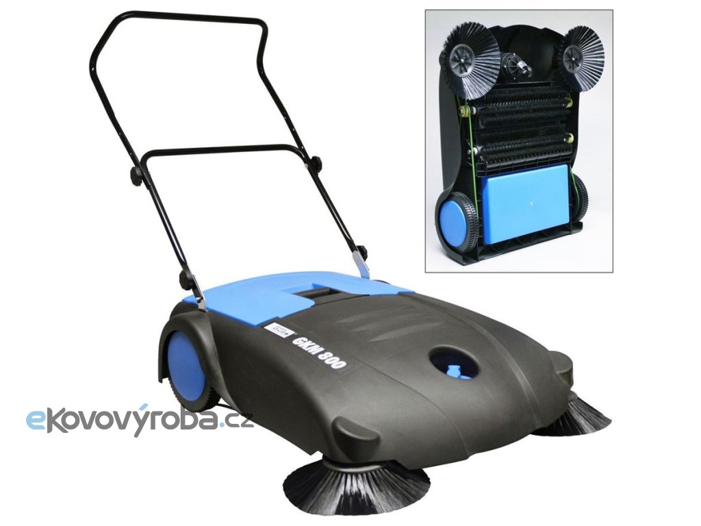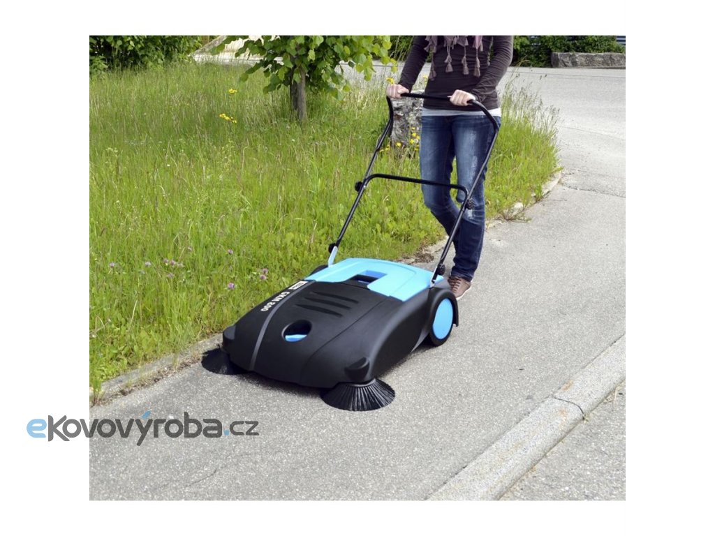 Mechanický úklidový stroj GÜDE, určený k zametání prachu nebo drobných nečistot ze středně velkých rovných (suchých) ploch - hal, chodeb, teras, vjezdů, dvorů apod.