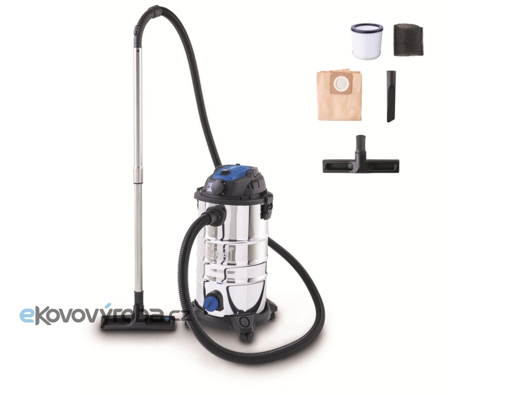 Srdcem přístroje je výkonný 2000 W elektromotor, jenž zajišťuje dlouhou životnost a spolehlivý chod. Velký pracovní dosah zajišťuje 6 m přívodní kabel, 3m hadice a komfortní teleskopická trubice. Odolná nádoba z nerezové oceli s objemem 30 litrů je vybavena rychloupínacím uzávěrem, který umožňuje snadnou výměnu sáčku. Díky praktické sadě držáků je možné příslušenství uložit přímo na vysavač, takže máte vše vždy po ruce. Pro pohodlnou manipulaci je přístroj vybaven ergonomickým madlem a čtyřmi otočnými kolečky, která umožňují hladký pohyb do všech směrů. Součástí stroje je i praktická zásuvka na 230 V s automatickým spínačem pro připojení elektrického nářadí.