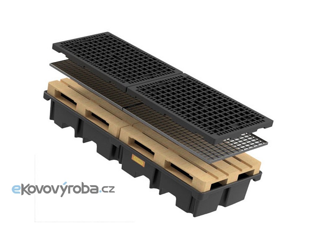 Polyethylenová záchytná vana pro 2x EURo paletu 120x80 cm za sebou nebo 4x sud 200 litrů. Záchytná vana se dodává bez roštu a paletu je možné umístit přímo na výstupky záchytné vany. Nosnost vany je 1200 kg a vana má záchytný objem 425 litrů.