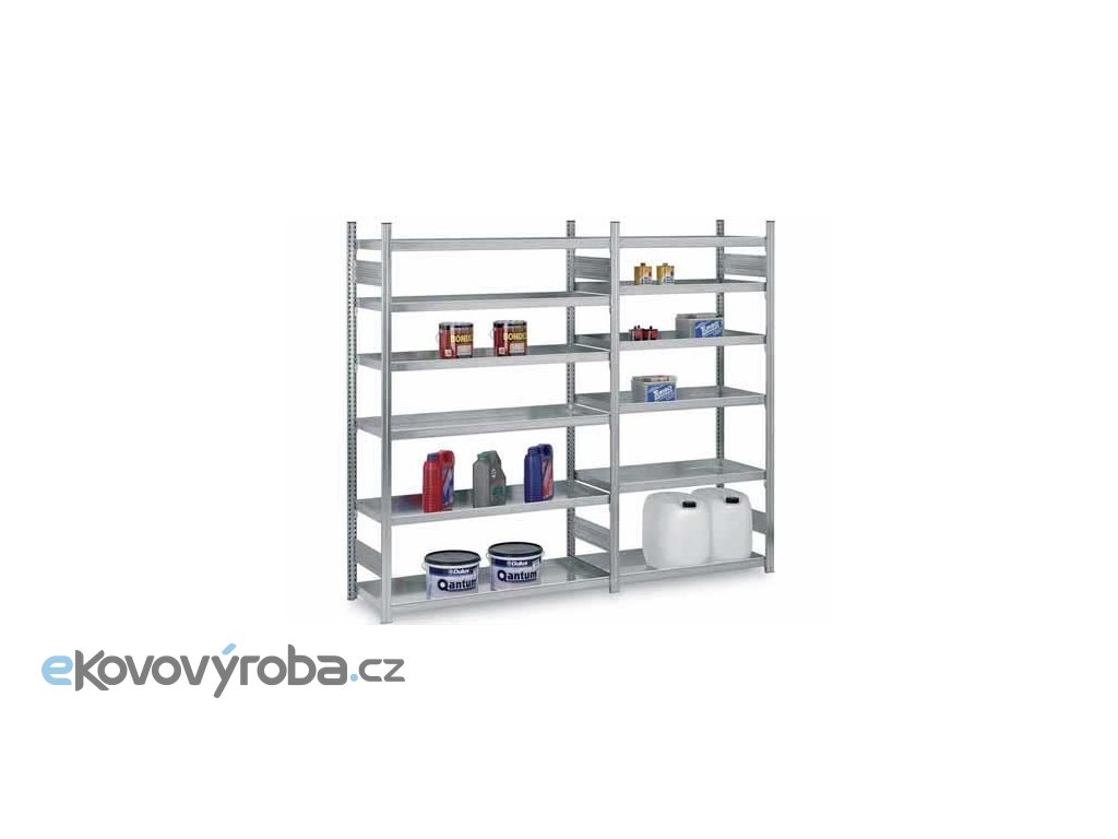 Přístavný regál na chemikálie s 5-ti vanovými policemi. Vanové police mají dokola lem vysoký 5 cm a nosnost 200 kg.    délka police 130 cm  hloubka police 40 cm  záchytný objem police 20 litrů  boční výška lemů police 50 mm  výška regálu 200 cm  přístavný regál  5 vanových polic v regálu  pozinkované provedení  nosnost police 200 kg  snadná montáž bez nutnosti použití nářadí (jen palička k sestavení rámů)