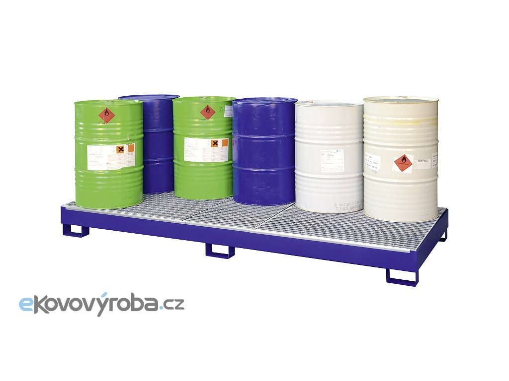 Záchytná vana ocelová typ SO10 bez roštu, pozinkované provedení, zatížení 2.800 kg, objem 462 l, kapacita 1 sud á 200 l a malé nádoby Rozměry: 300,6 x 120 x 25,6 cm