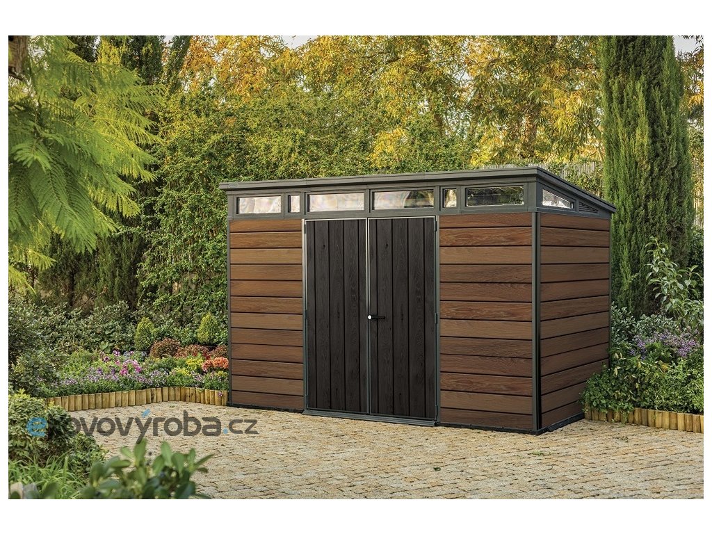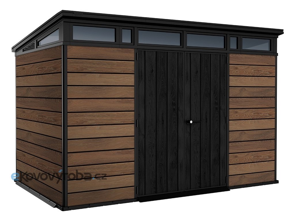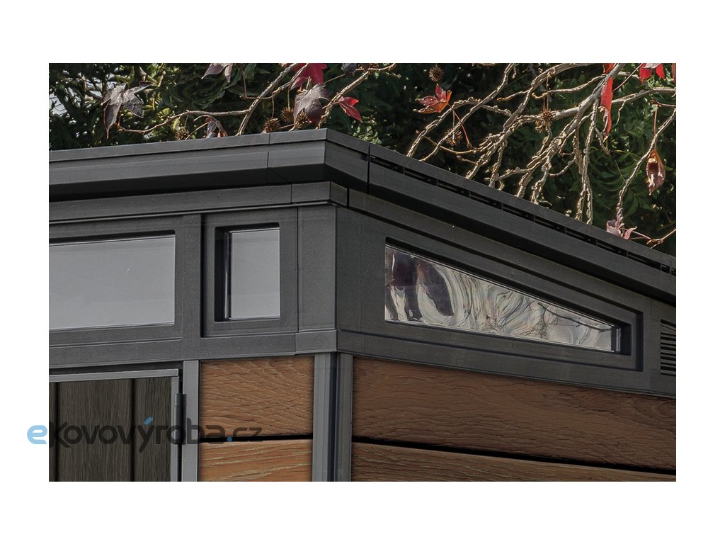 Bezúdržbový domek PENT 11x7 je vyroben z jedinečného materiálu DECOCOAT, který je inspirován moderním vzhledem v imitaci dřeva. Domek má robustní konstrukci s dvojitými stěnami a kovové výztuhy. Je také vybaven pevnou designovou střechou, širokými dvojitými dveřmi a podlahou pro náročné použití s nosností 150kg na m2. Domek je ideální nejen na uschovávání nářadí a zahradních doplňků, ale také na sekačku nebo grill. Jeho hlavní výhody jsou stabilní, zpevněná ocelová konstrukce, pevná střecha a široké dvojité dveře. Všechny domky Keter jsou vybaveny vysoce odolnou podlahou. Zatížení střechy až 150 kg/m2, odolnost vůči větru do 145 km/hod (platí v případě ukotvení). Rozměr dveří: 140x182 cm výhody:- Dvojitá stěna odolná proti povětrnostním vlivům s ocelovou výztuží- Unikátní stěny DECOCOAT- Široké dvojité dveře, viktoriánské okno a světlíky- Vysoká podlaha- Robustní strop- Vysoký strop- Zajišťovací systém (zámek není součástí dodávky)