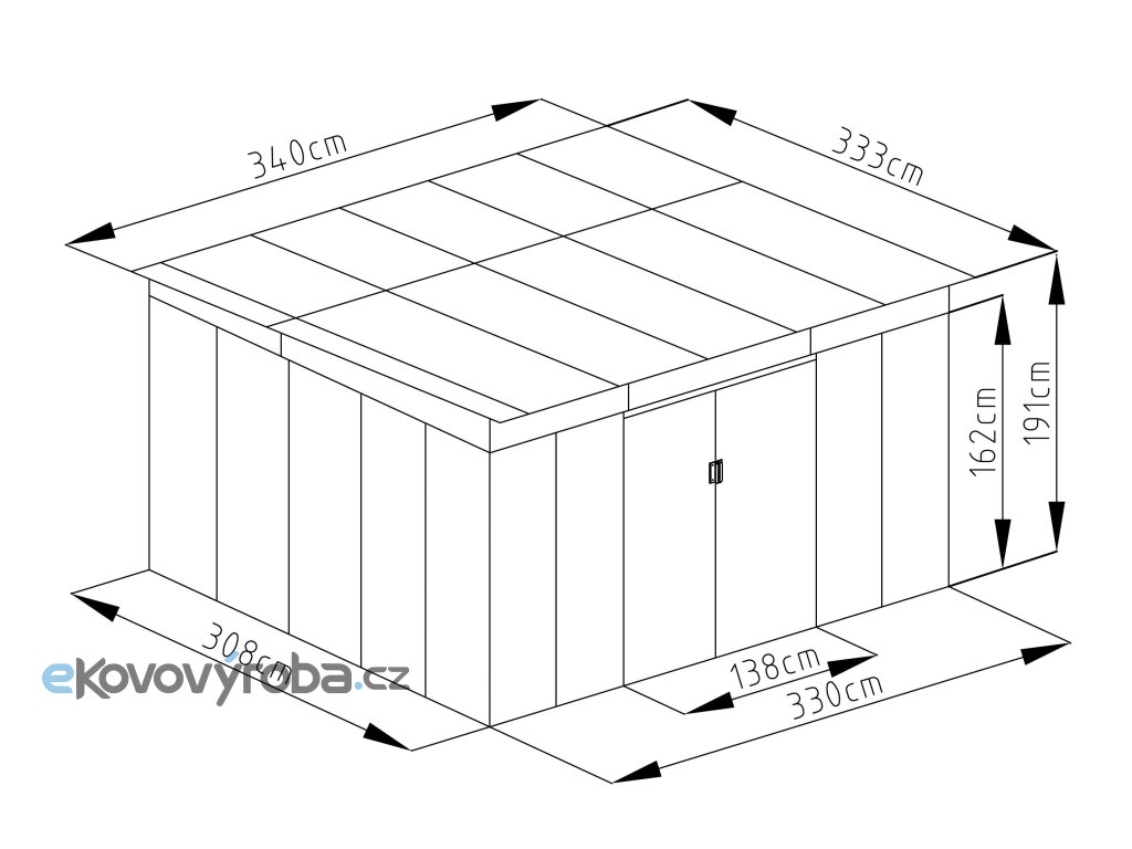 - Vnější rozměry – se střechou (š x d x v): 340 x 333 x 191 cm