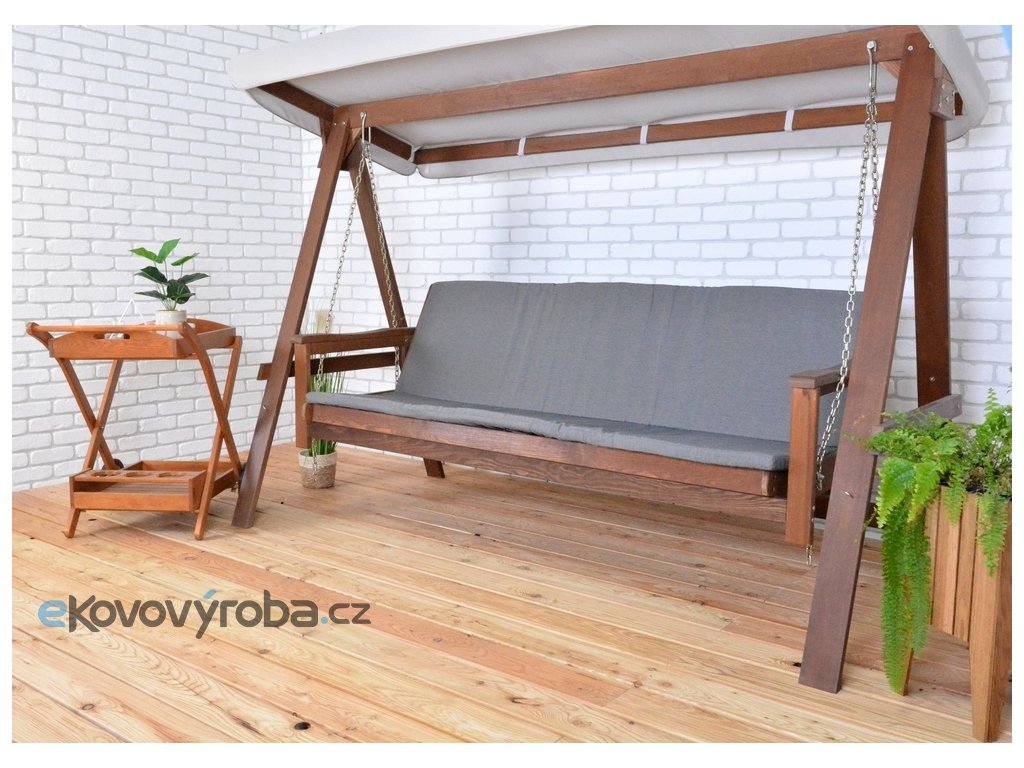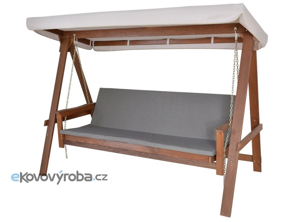 Robustní konstrukce z mořeného borovicového dřeva zaručuje vysokou pevnost a dlouhou životnost produktu. Opěrák je možno sklopit a vytvořit tak lůžkovou úpravu. Vysoké a pohodlné podušky - tloušťka 4 cm, včetně látkové stříšky. Certifikát FSC zaručuje, že použité dřevo pochází ze šetrně obhospodařovaných lesů, ve kterých jsou dodržovány přísné ekologické asociální požadavky.