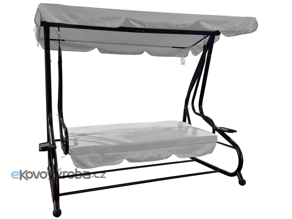Stylová a pohodlná zahradní houpačka s pevnou a stabilní kovovou konstrukcí - lze rozložit do polohy k ležení pro ještě větší odpočinek. Součástí houpačky jsou i odkládací stolky na každé straně, ideální pro odložení nápojů a telefonu. Houpačka obsahuje polstry - jsou položeny na látce, která je navlečena na kovovém rámu. Ocelová konstrukce ošetřena práškovou barvou, podušky (voděodolný polyester 160 g), výplň polyesterová vata 8 cm, stříška (voděodolný polyester 180 g), pro 3 osoby Možné rozložit na lůžko.