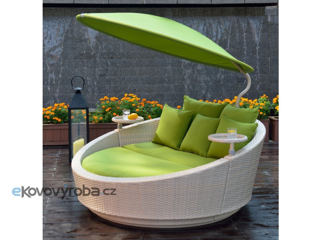 Postel je vybavená otáčecím mechanismem o 360°, který zajistí maximální pohodlí při odpočinku.Na každé straně postele je upevněný pohyblivý stolek a nad postelí je pohyblivá sluneční clona. Polštáře jsou vyrobené z POLYESTERU (230g/m²), který nesaje vlhkost, jsou plně napěchované vyplněné molitanem a opatřené zipem, což umožňuje pohodlné praní povlaku. Ratanový nábytek vyniká snadnou údržbou a velkou odolností vůči nepříznivému počasí. Umělý ratan odolává UV záření a teplotě od + 50°C do –10 °C. Díky hliníkové konstrukci je na svou velikost velmi lehký. Ratanový nábytek má velmi široké využití. Je vhodný jak do interiéru tak do exteriéru. Nábytek z umělého ratanu je možné využít prakticky všude – balkon, zahrada, terasa, zimní zahrada, obytné prostory, kanceláře, recepce a další komerční prostory. Umělý ratan se podobá přírodnímu ratanu ale na rozdíl od něj je velmi pružný, tudíž je méně pravděpodobné, že se poničí. Umělý ratan se neloupe, nepraská a je stálobarevný. Nábytek se snadno se čistí stačí ho omýt hadicí nebo mýdlovou vodou. Tato postel bude vynikat v každém interiéru nebo exteriéru.