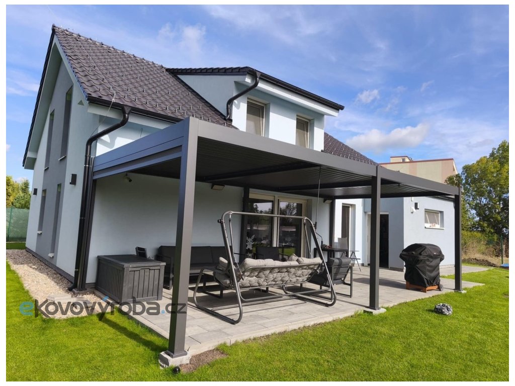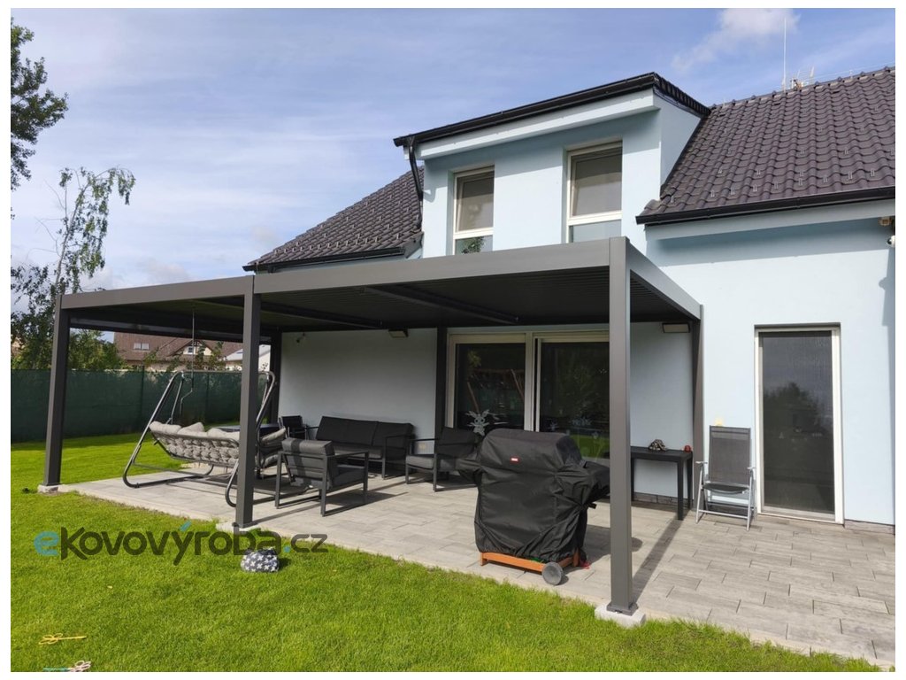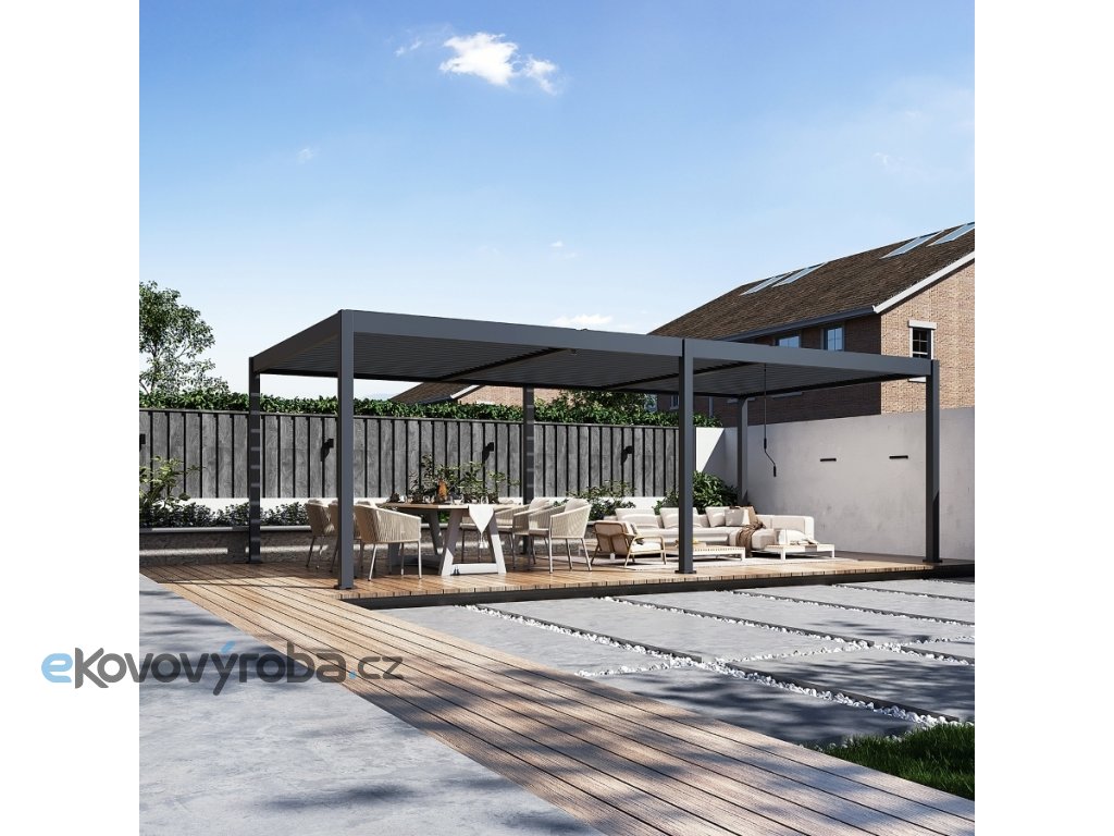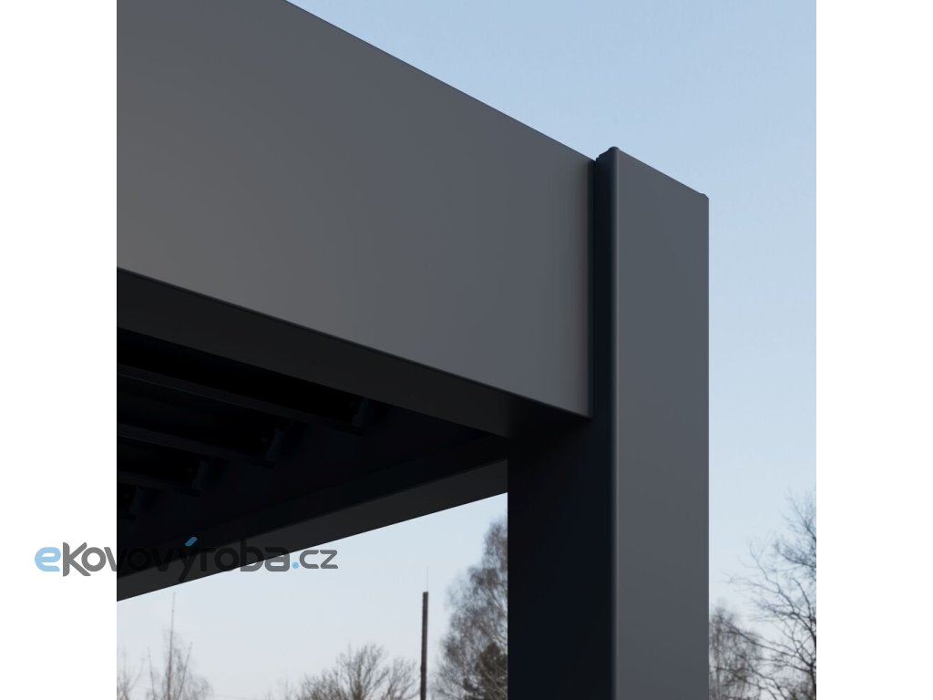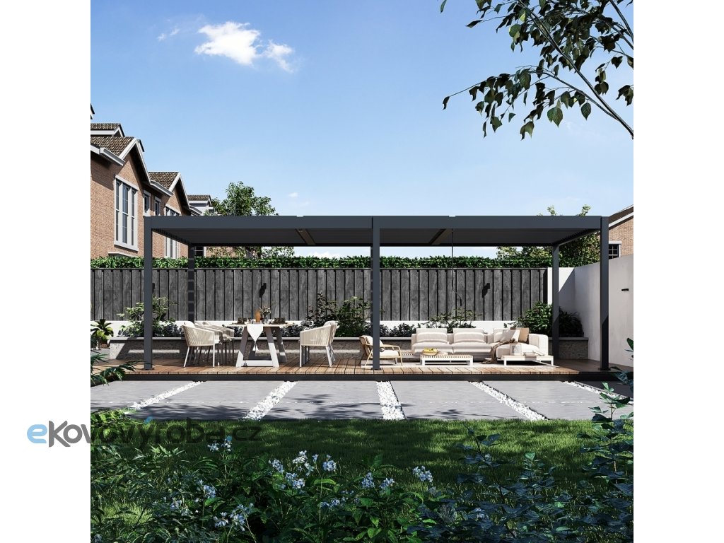 Prémiová zahradní hliníková volně stojící bioklimatická pergola o rozměrech 8x4 metry představuje ideální způsob zastřešení Vašeho venkovního posezení a poskytne Vám opravdu velkou zastřešenou plochu. Velmi pevná a stabilní konstrukce v antracitové barvě RAL 7016, v matné povrchové úpravě se hodí do každého prostoru, není zapotřebí vrtat do stěny. Pergola je vyrobena z vysoce kvalitního hliníku, který je ošetřen práškovou barvou, což zaručuje odolnost vůči povětrnostním vlivům. Lamely jsou rozděleny na 3 zóny a každou tuto část je možné ovládat zvlášť. 75 nastavitelných otočných lamel Vás ochrání nejen před sluncem, ale i před deštěm. Lamely lze otáčet od 0°, kdy docílíte úplně uzavřené střechy až do 135°, díky čemuž získáte skvělou mobilitu a možnost zastínit slunce z jakékoliv strany. Lamely lze ovládat jednoduše manuálně pomocí kličky. Ta je navržena tak, abyste lamely mohli snadno otočit do požadované polohy a aby při otáčení lamel nedocházelo k poškrábání konstrukce pergoly. Zároveň je klička na konstrukci umístěna tak, aby při doplnění pergoly o zástěny či panely nebránila ve snadné manipulaci s těmito doplňky. Kličku můžete jednoduše sundat. Ke svodu vody dochází unikátním drenážním systémem přímo uvnitř konstrukce. Lamely jsou schopné odvést opravdu velké množství vody až 17 l/m2 za hodinu.V zimních měsících je zapotřebí ponechat lamely ve svislé pozici. I přesto jsou lamely schopné unést 30-40 centimetrovou vrstvu sněhu, což představuje zátěž přibližně 50 kg/m2. Toto zatížení však nemůže být dlouhodobé. Kteroukoliv stranu pergoly lze doplnit o zástěnu. V nabídce máme čtyřmetrové zástěny s hliníkovou konstrukcí a výplní z textilenu, které poskytnou ochranu před větrem a zároveň vytvoří příjemný stín. Pergolu je také možné doplnit o stínicí panely s fixními či sklápěcími horizontálními lamelami pro dodatečné soukromí a zastínění. Díky skvělým vlastnostem, detailnímu zpracování a modernímu designu bioklimatické pergoly využijete venkovní posezení mnohem častěji. Robustní sloupek má rozměry 116x116 mm, při instalaci je zapotřebí počítat s patkou sloupku o rozměrech 160x160 mm. Patka je z 8 mm silné oceli a je navíc zakryta hliníkovým krytem (165x165 mm) s integrovaným drenážním systémem. Vyvýšený hliníkový profil s přidanou horní lištou ukrývá lamely tak, že z bočního pohledu nejsou viditelné a jsou v jedné linii s profilem. Mezi jednotlivými zónami s lamelami jsou pevné nosníky, do kterých se nemusíte bát instalovat například osvětlení. S bioklimatickou pergolou si můžete užívat maximum slunečních paprsků, zároveň se můžete proti těmto paprskům i chránit správným nastavením lamel. Pergola též umožňuje snadnou ventilaci prostoru a naopak dokonalý přístřešek v případě deště. HLAVNÍ VÝHODY 75 hliníkových lamel rozdělená střešní část na 3 zóny flexibilnější lamely s úhlem otočení od 0° do 135° vyvýšená horní lišta hliníkového profilu - lamely nejsou vidět ani při otáčení integrovaný drenážní systém celohliníková konstrukce - silné nosníky nejsou viditelné spojovací prvky, šrouby - hladká konstrukce ROZMĚRY PERGOLY